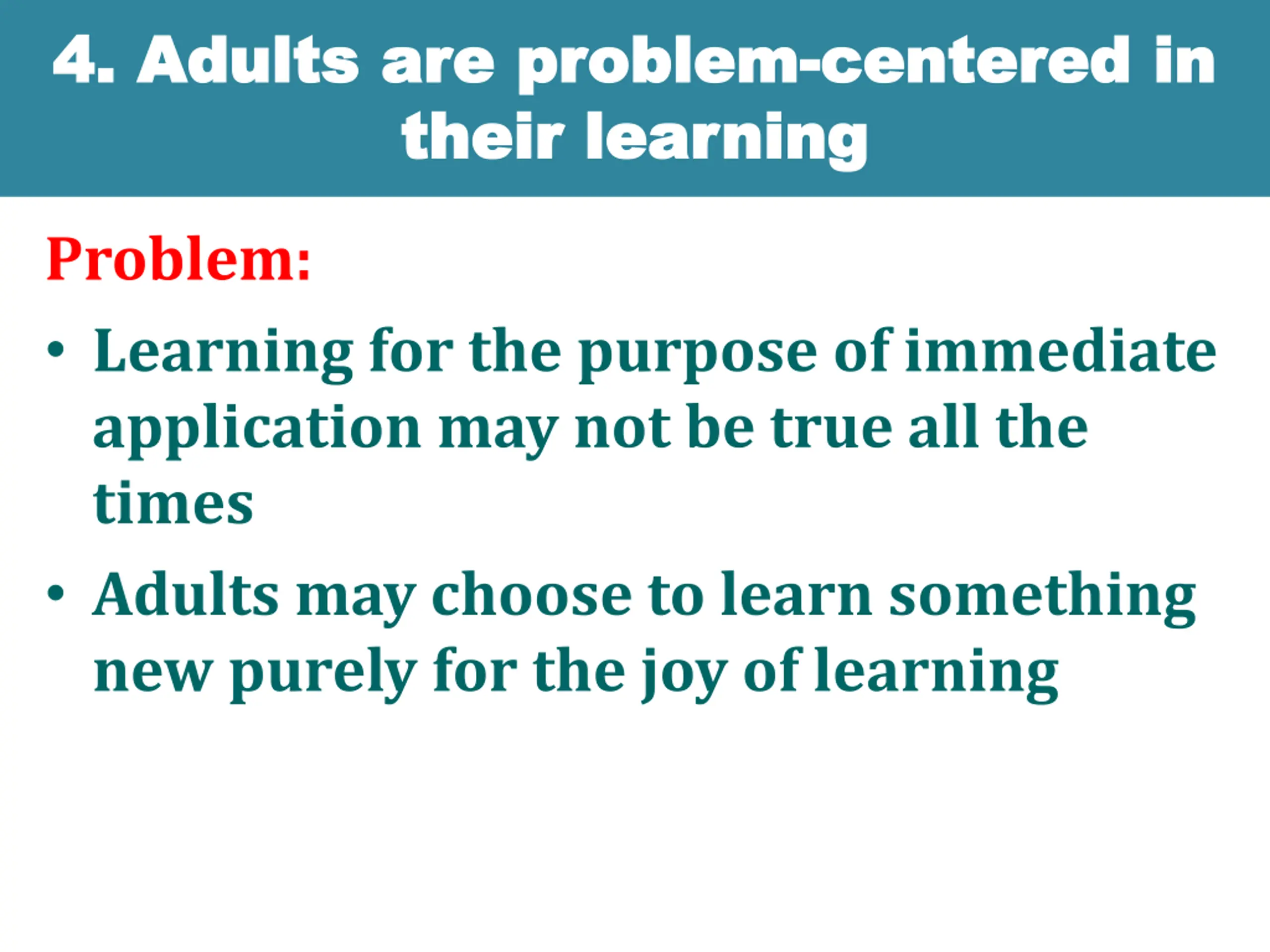 4. Adults 4. Adults are problem are problem- -centered in their their learning learning centered in Problem: Learning for the purpose of immediate application may not be true all the times Adults may choose to learn something new purely for the joy of learning