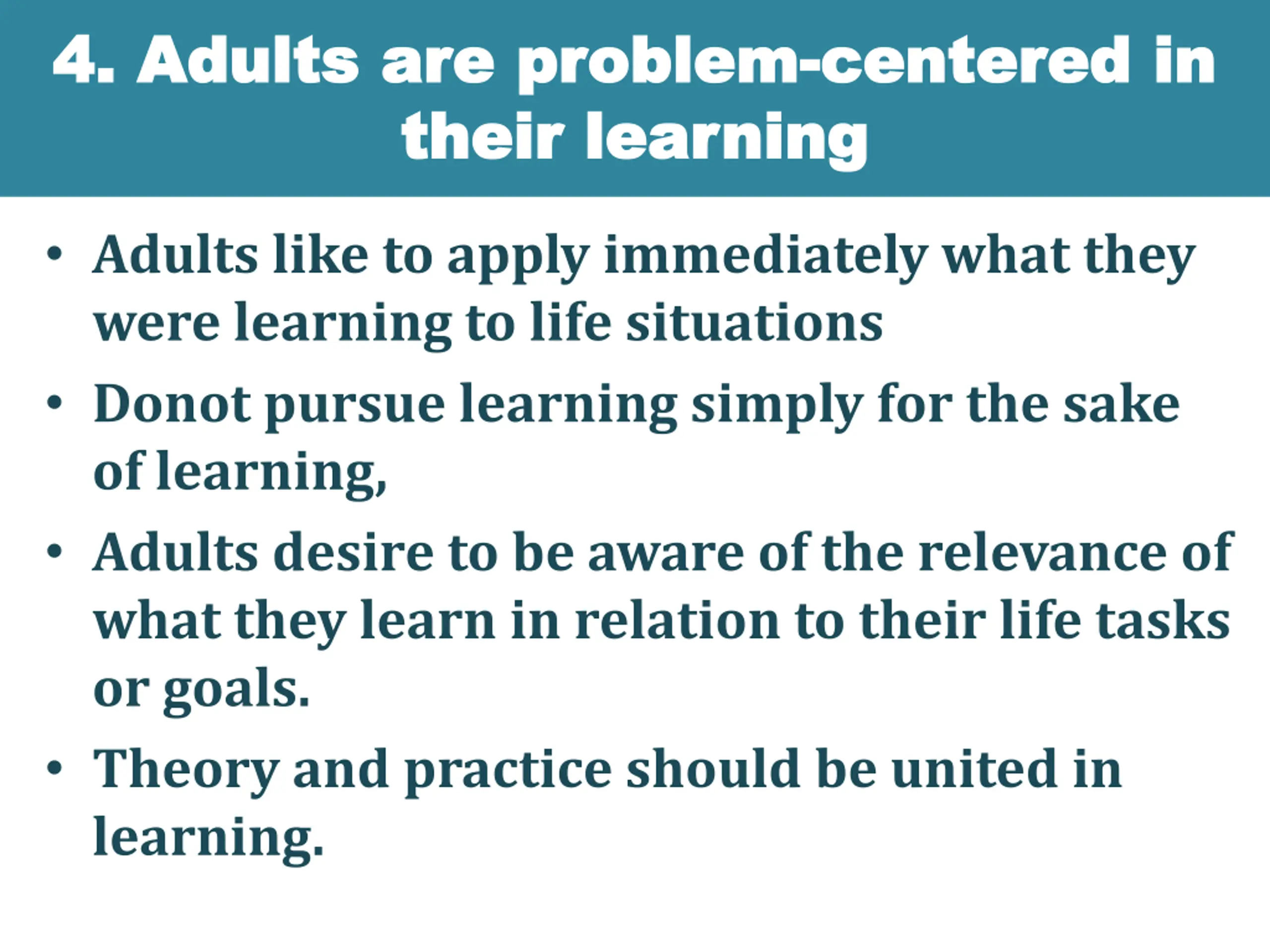 4. Adults 4. Adults are problem are problem- -centered in their their learning learning centered in Adults like to apply immediately what they were learning to life situations Donot pursue learning simply for the sake of learning, Adults desire to be aware of the relevance of what they learn in relation to their life tasks or goals. Theory and practice should be united in learning.