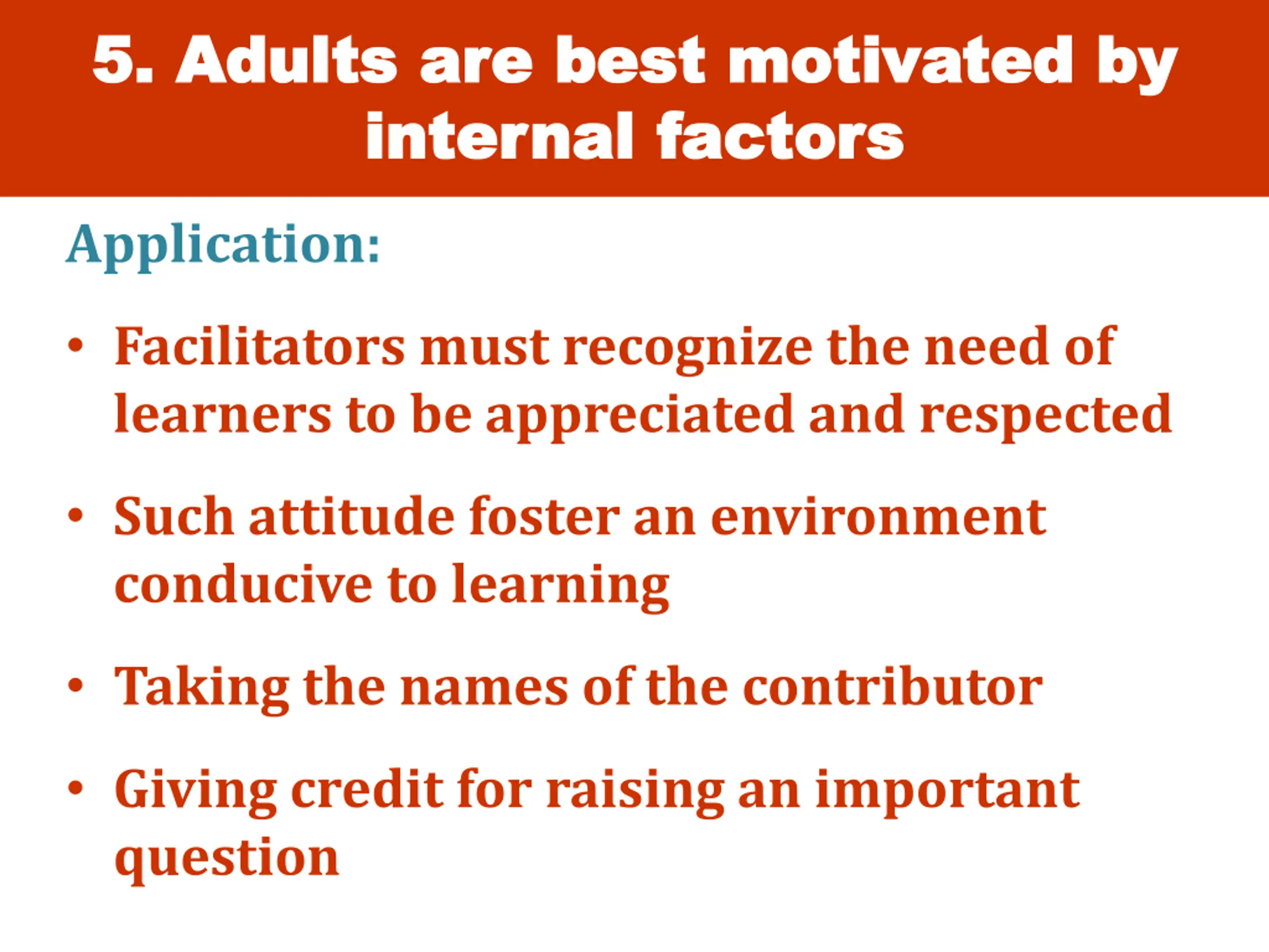 5. Adults 5. Adults are best motivated by are best motivated by internal factors internal factors Application: Facilitators must recognize the need of learners to be appreciated and respected Such attitude foster an environment conducive to learning Taking the names of the contributor Giving credit for raising an important question