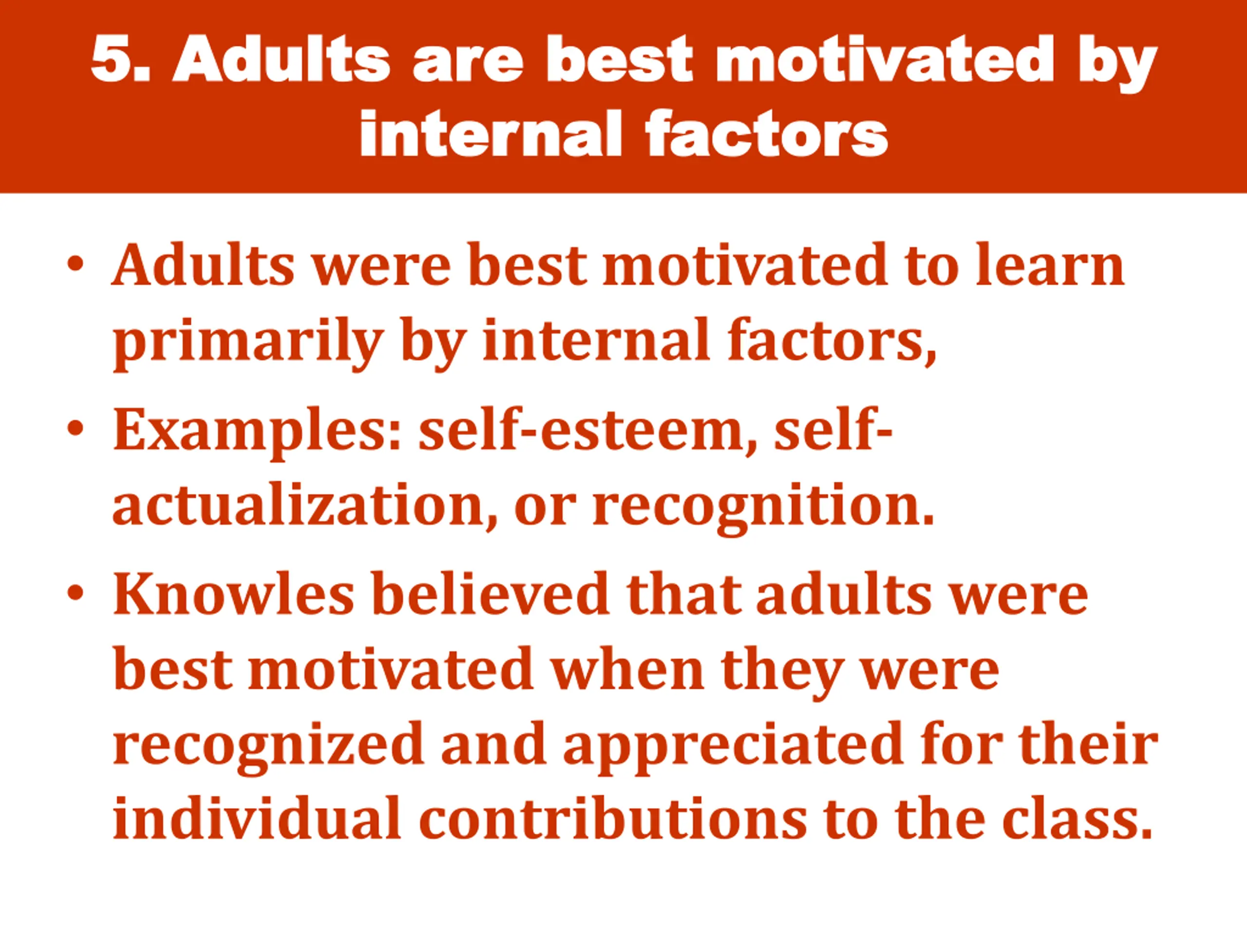 5. Adults 5. Adults are best motivated by are best motivated by internal factors internal factors Adults were best motivated to learn primarily by internal factors, Examples: self-esteem, self- actualization, or recognition. Knowles believed that adults were best motivated when they were recognized and appreciated for their individual contributions to the class.