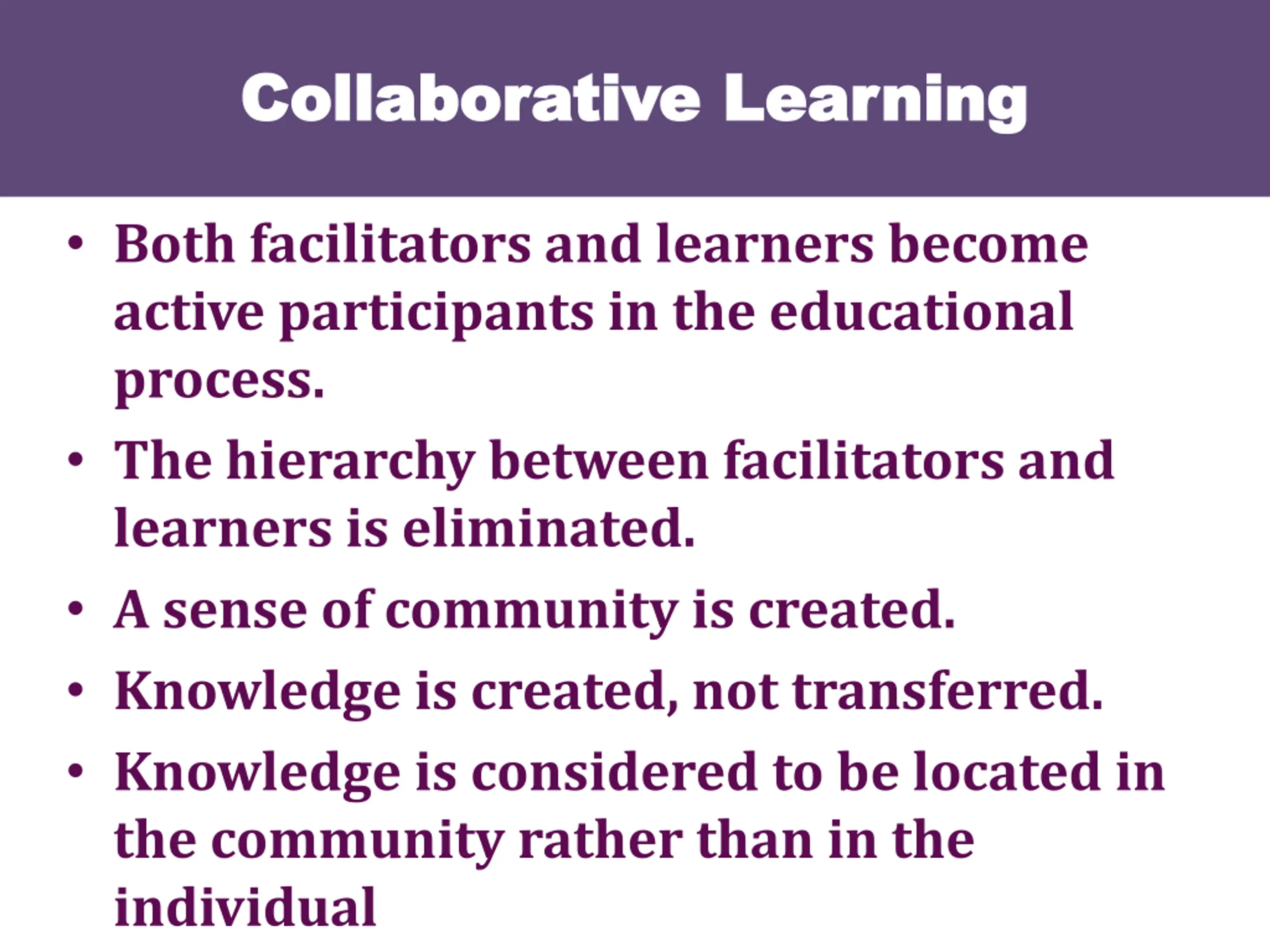 Collaborative Learning Collaborative Learning Both facilitators and learners become active participants in the educational process. The hierarchy between facilitators and learners is eliminated. A sense of community is created. Knowledge is created, not transferred. Knowledge is considered to be located in the community rather than in the individual