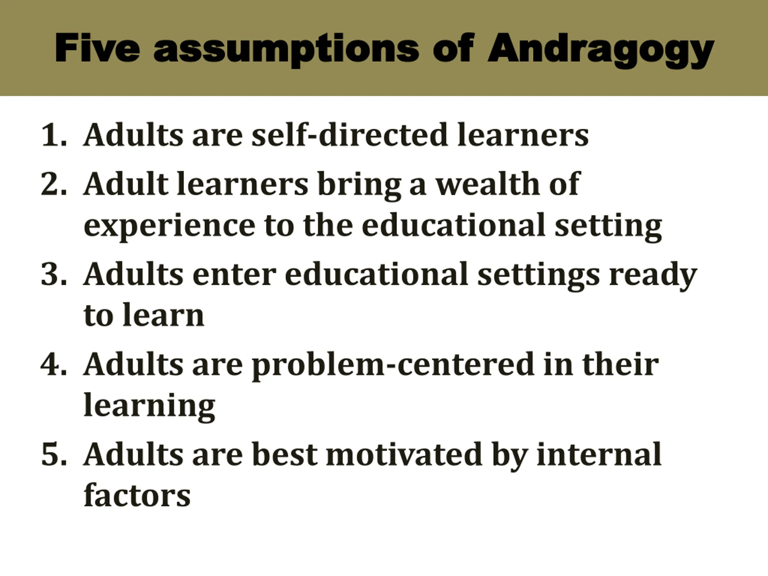 Five Five assumptions of assumptions of Andragogy Andragogy 1. Adults are self-directed learners 2. Adult learners bring a wealth of experience to the educational setting 3. Adults enter educational settings ready to learn 4. Adults are problem-centered in their learning 5. Adults are best motivated by internal factors