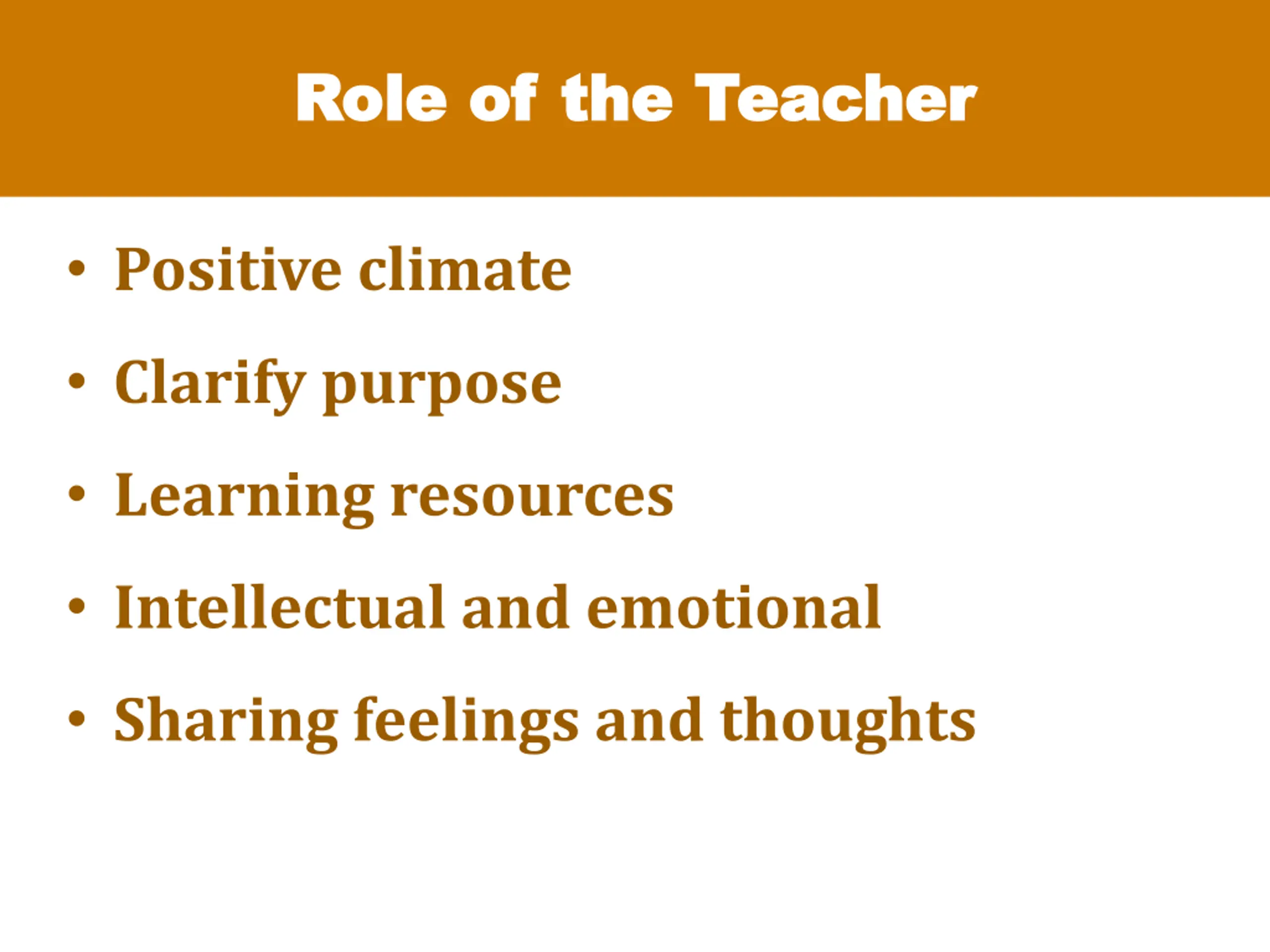 Role of the Teacher Role of the Teacher Positive climate Clarify purpose Learning resources Intellectual and emotional Sharing feelings and thoughts