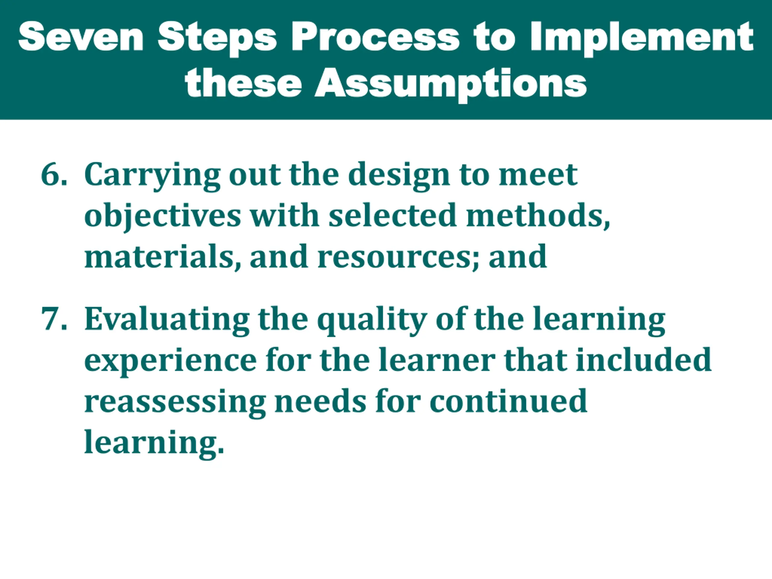 Seven Steps Process to Implement Seven Steps Process to Implement these Assumptions these Assumptions 6. Carrying out the design to meet objectives with selected methods, materials, and resources; and 7. Evaluating the quality of the learning experience for the learner that included reassessing needs for continued learning.
