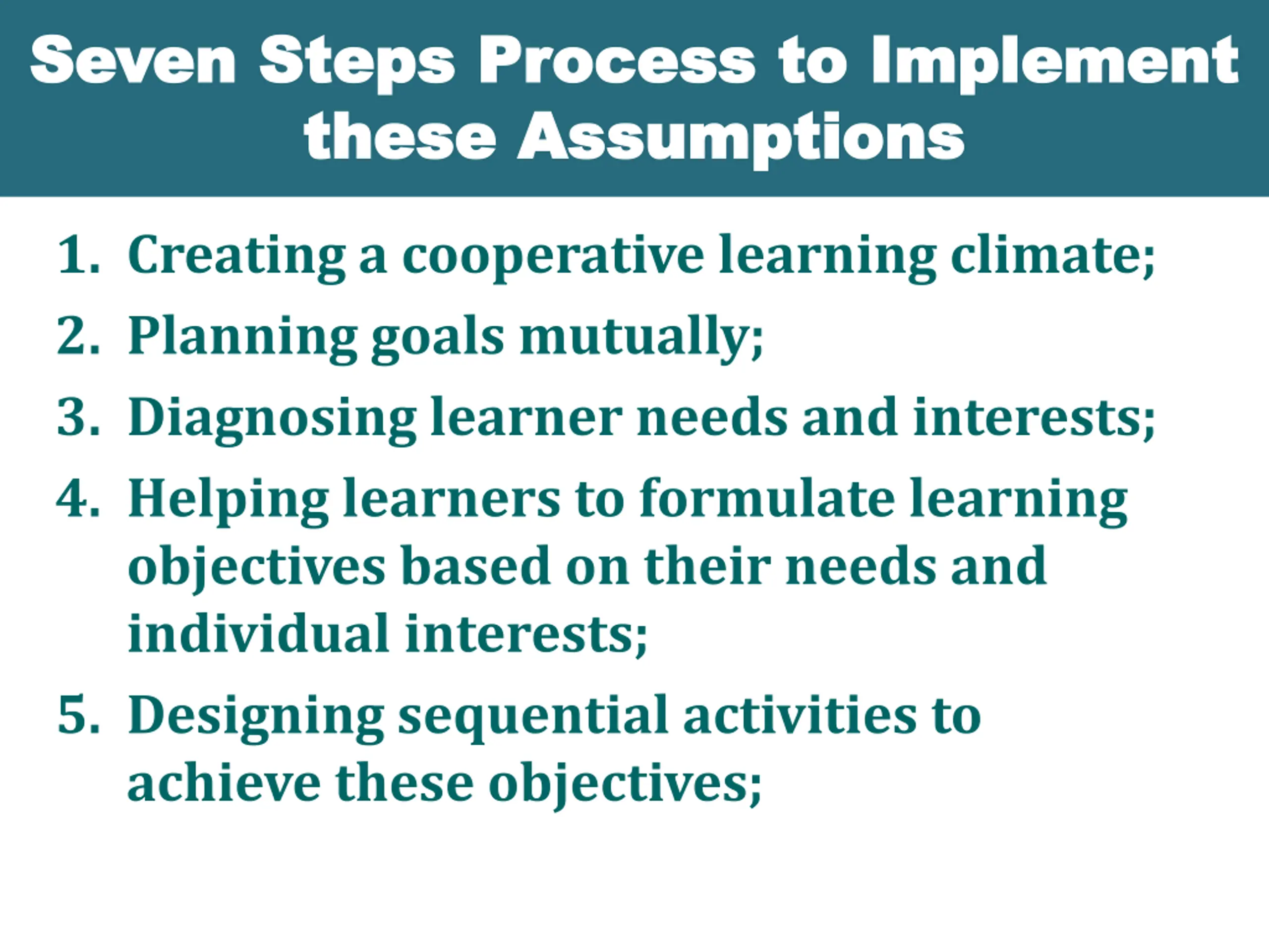 Seven Steps Process to Implement Seven Steps Process to Implement these Assumptions these Assumptions 1. Creating a cooperative learning climate; 2. Planning goals mutually; 3. Diagnosing learner needs and interests; 4. Helping learners to formulate learning objectives based on their needs and individual interests; 5. Designing sequential activities to achieve these objectives;