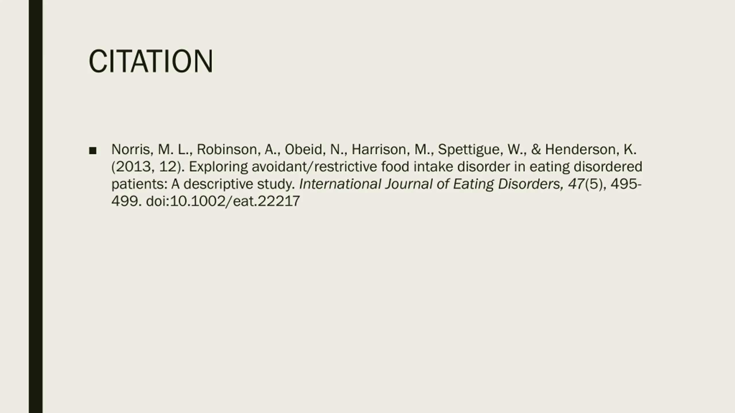 CITATION Norris, M. L., Robinson, A., Obeid, N., Harrison, M., Spettigue, W., & Henderson, K. (2013, 12). Exploring avoidant/restrictive food intake disorder in eating disordered patients: A descriptive study. International Journal of Eating Disorders, 47(5), 495- 499. doi:10.1002/eat.22217