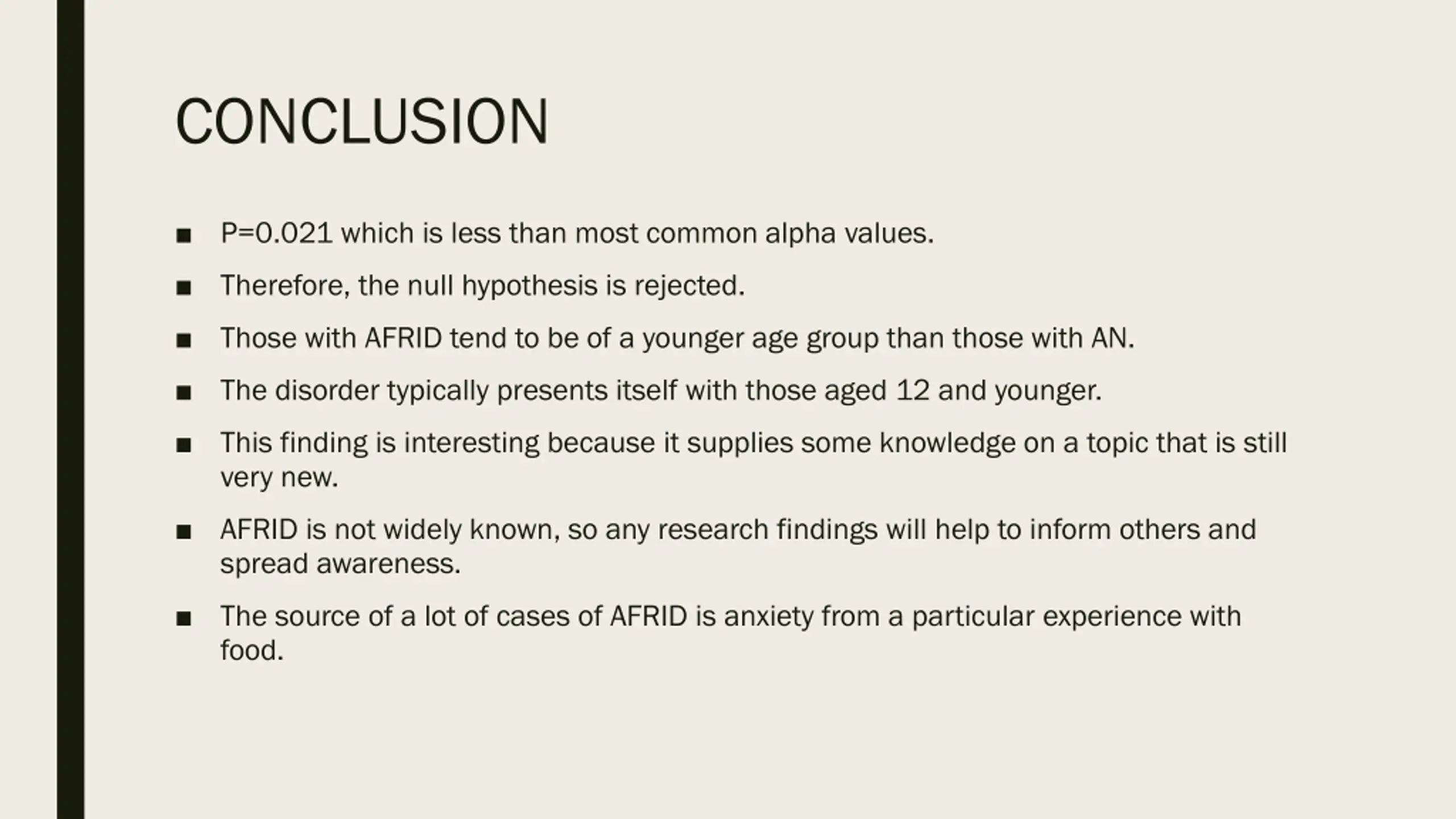 CONCLUSION P=0.021 which is less than most common alpha values. Therefore, the null hypothesis is rejected. Those with AFRID tend to be of a younger age group than those with AN. The disorder typically presents itself with those aged 12 and younger. This finding is interesting because it supplies some knowledge on a topic that is still very new. AFRID is not widely known, so any research findings will help to inform others and spread awareness. The source of a lot of cases of AFRID is anxiety from a particular experience with food.