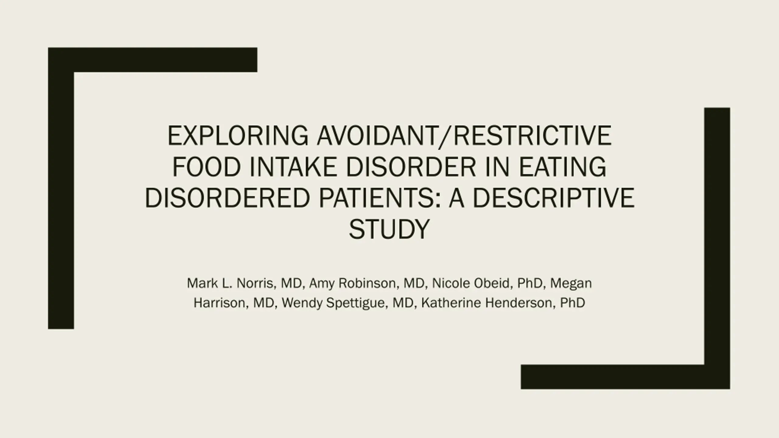 EXPLORING AVOIDANT/RESTRICTIVE FOOD INTAKE DISORDER IN EATING DISORDERED PATIENTS: A DESCRIPTIVE STUDY Mark L. Norris, MD, Amy Robinson, MD, Nicole Obeid, PhD, Megan Harrison, MD, Wendy Spettigue, MD, Katherine Henderson, PhD