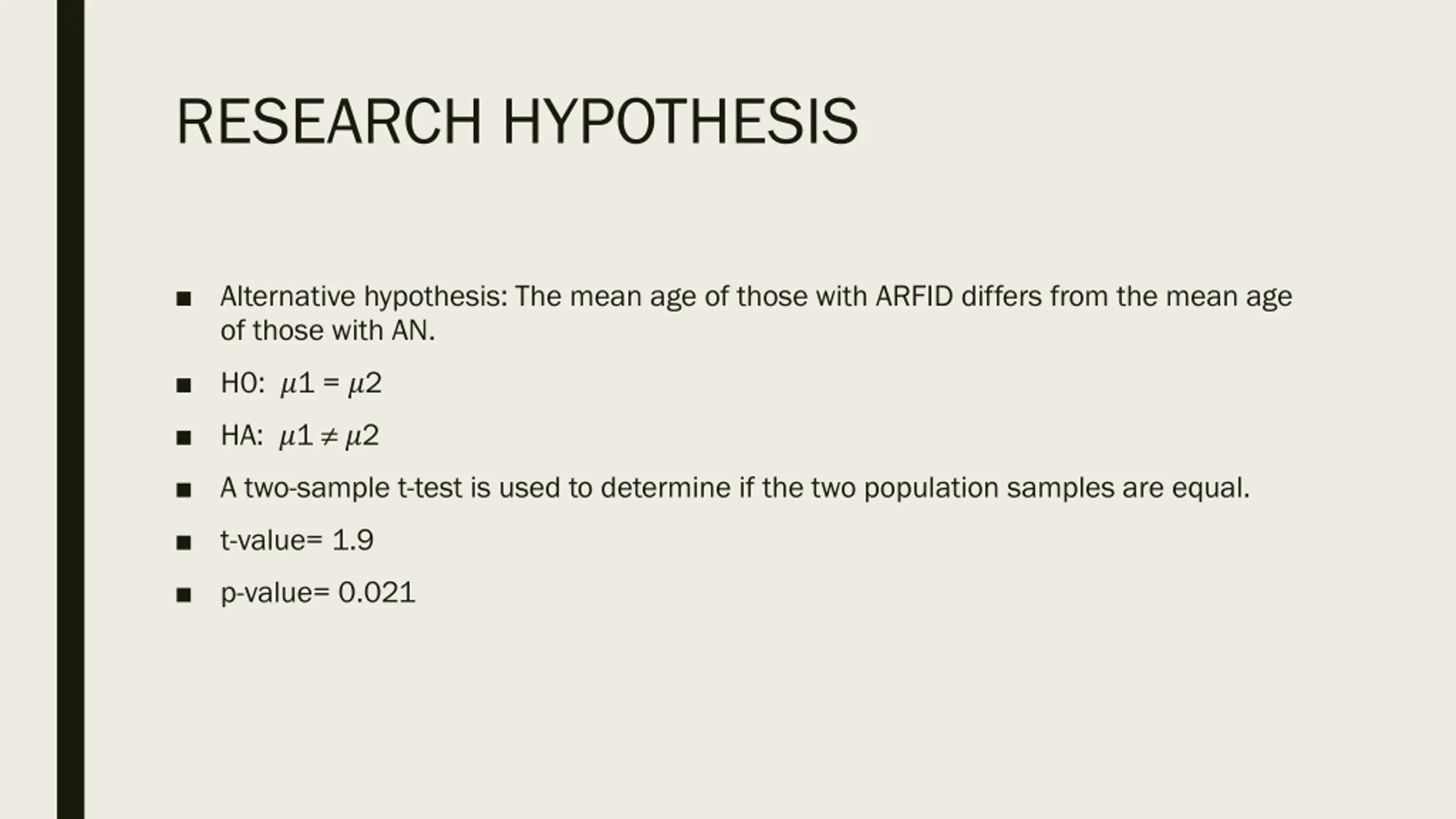 RESEARCH HYPOTHESIS Alternative hypothesis: The mean age of those with ARFID differs from the mean age of those with AN. H0: ?1 = ?2 HA: ?1 ?2 A two-sample t-test is used to determine if the two population samples are equal. t-value= 1.9 p-value= 0.021