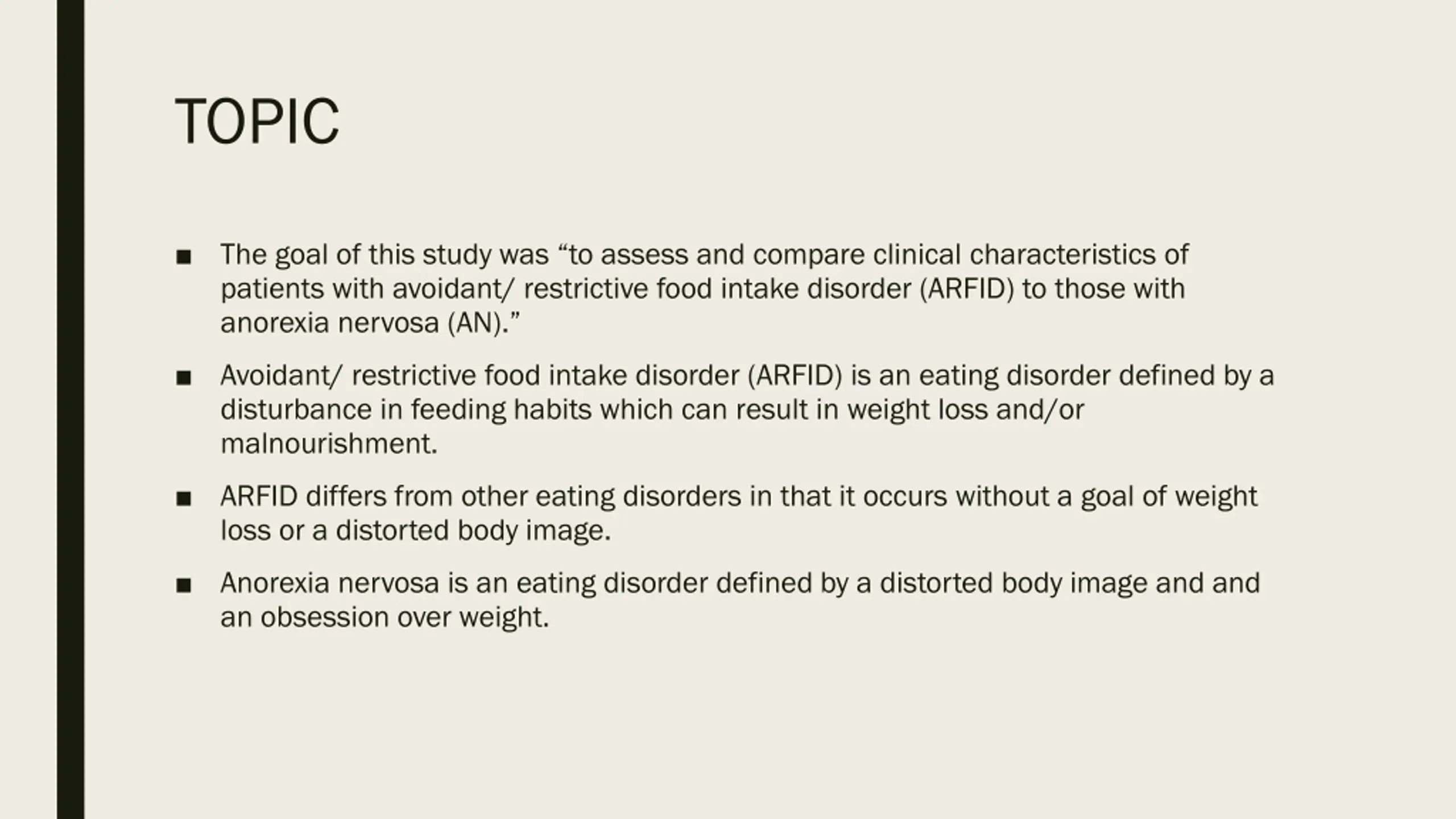 TOPIC The goal of this study was to assess and compare clinical characteristics of patients with avoidant/ restrictive food intake disorder (ARFID) to those with anorexia nervosa (AN). Avoidant/ restrictive food intake disorder (ARFID) is an eating disorder defined by a disturbance in feeding habits which can result in weight loss and/or malnourishment. ARFID differs from other eating disorders in that it occurs without a goal of weight loss or a distorted body image. Anorexia nervosa is an eating disorder defined by a distorted body image and and an obsession over weight.
