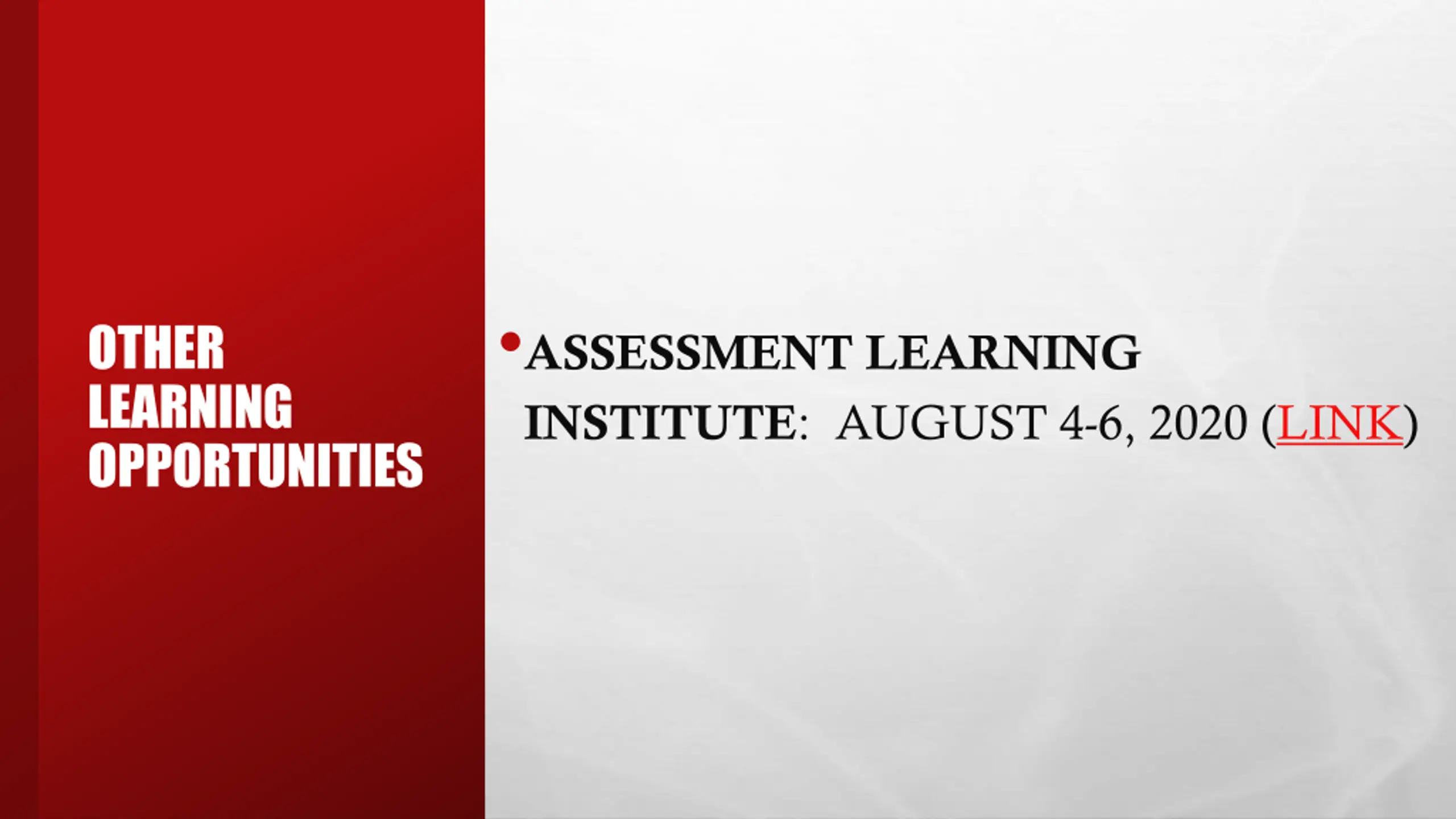 ASSESSMENT LEARNING INSTITUTE: AUGUST 4-6, 2020 (LINK) OTHER LEARNING OPPORTUNITIES