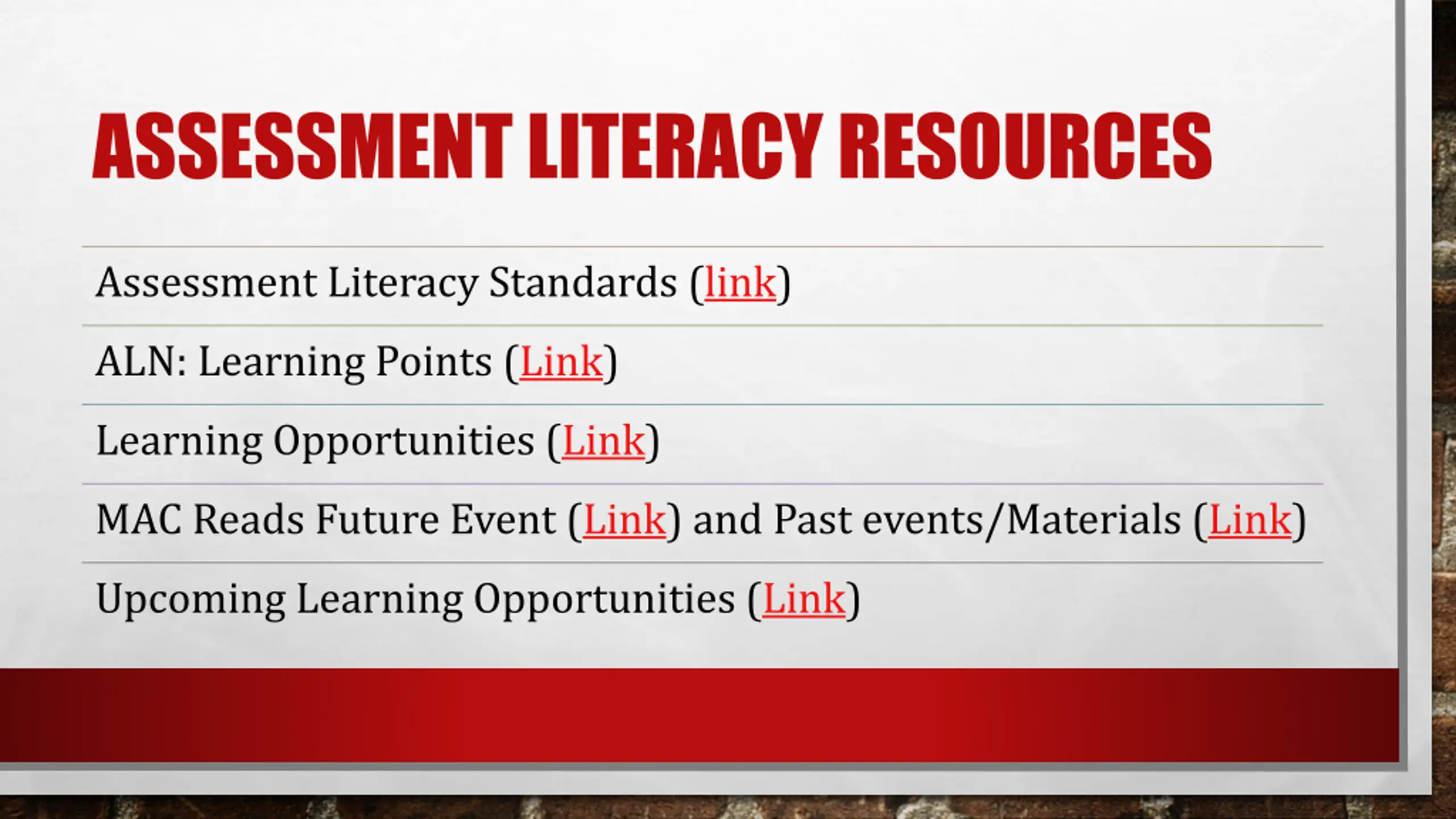 ASSESSMENT LITERACY RESOURCES Assessment Literacy Standards (link) link ALN: Learning Points (Link) Link Learning Opportunities (Link) Link MAC Reads Future Event (Link) and Past events/Materials (Link) Link Link Upcoming Learning Opportunities (Link) Link