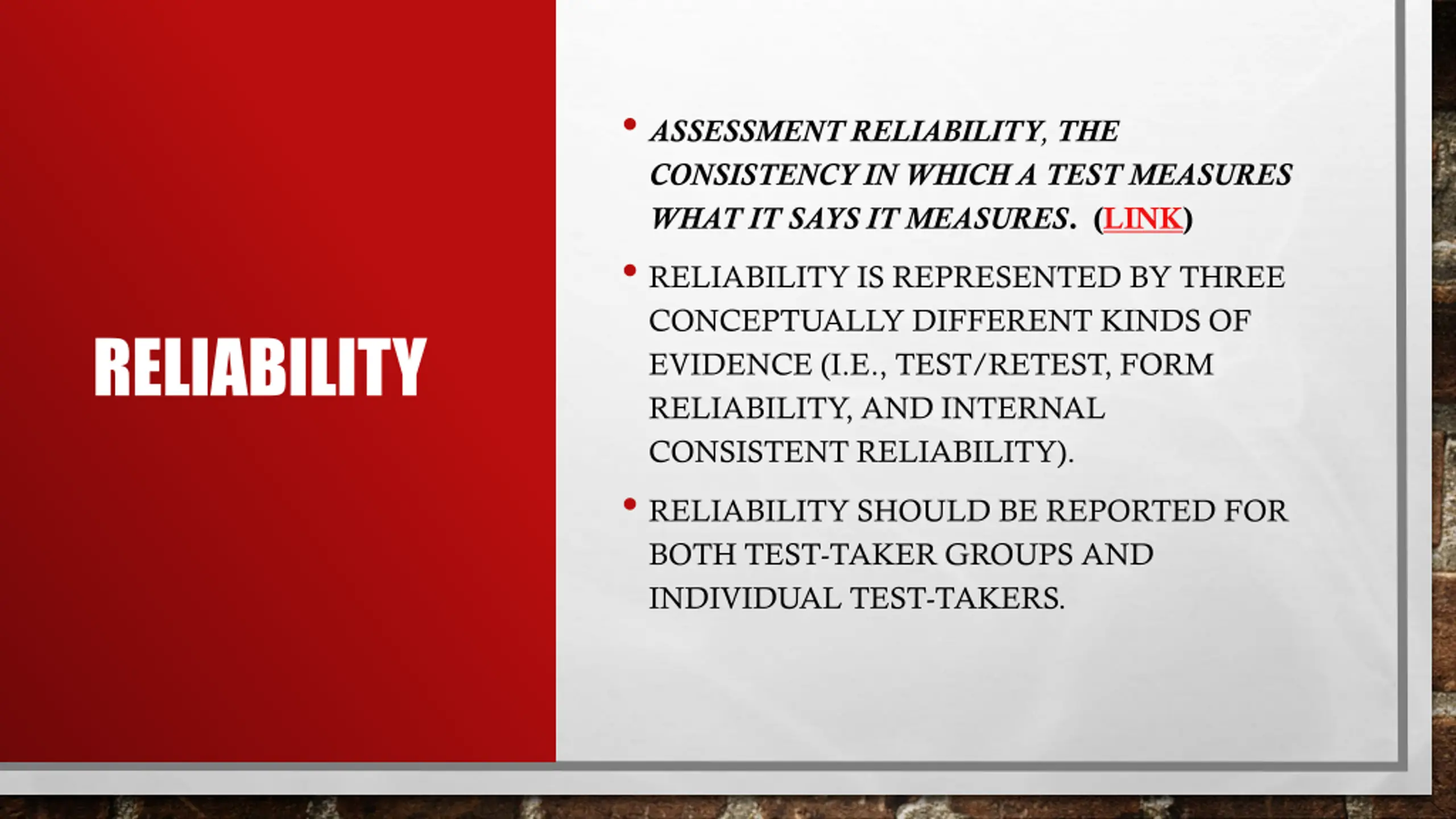 ASSESSMENT RELIABILITY, THE CONSISTENCY IN WHICH A TEST MEASURES WHAT IT SAYS IT MEASURES. (LINK) RELIABILITY IS REPRESENTED BY THREE CONCEPTUALLY DIFFERENT KINDS OF EVIDENCE (I.E., TEST/RETEST, FORM RELIABILITY, AND INTERNAL CONSISTENT RELIABILITY). RELIABILITY SHOULD BE REPORTED FOR BOTH TEST-TAKER GROUPS AND INDIVIDUAL TEST-TAKERS. RELIABILITY