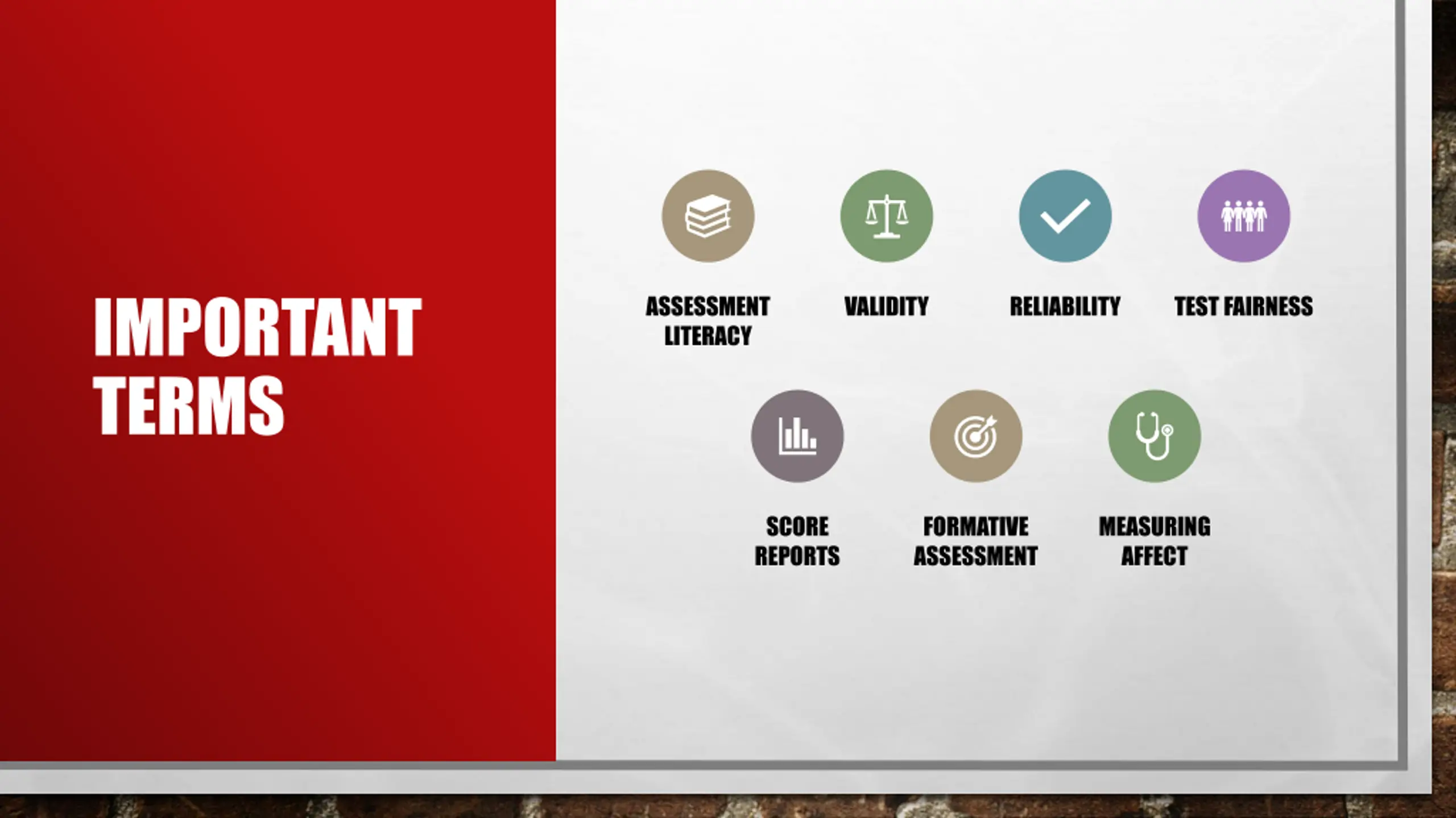 IMPORTANT TERMS ASSESSMENT LITERACY VALIDITY RELIABILITY TEST FAIRNESS SCORE REPORTS FORMATIVE ASSESSMENT MEASURING AFFECT
