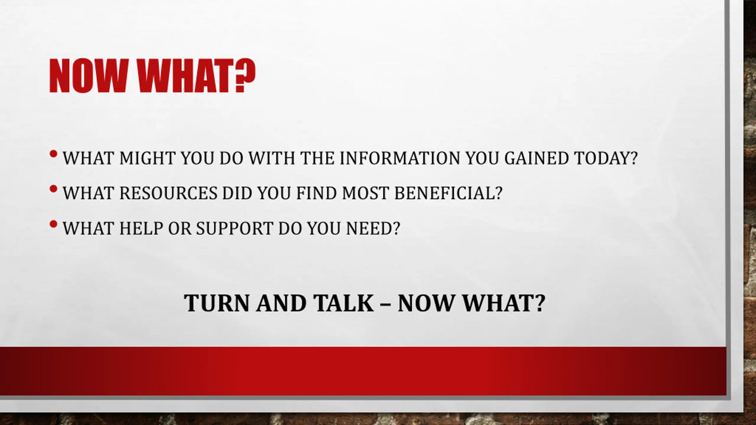 NOW WHAT? WHAT MIGHT YOU DO WITH THE INFORMATION YOU GAINED TODAY? WHAT RESOURCES DID YOU FIND MOST BENEFICIAL? WHAT HELP OR SUPPORT DO YOU NEED? TURN AND TALK NOW WHAT?