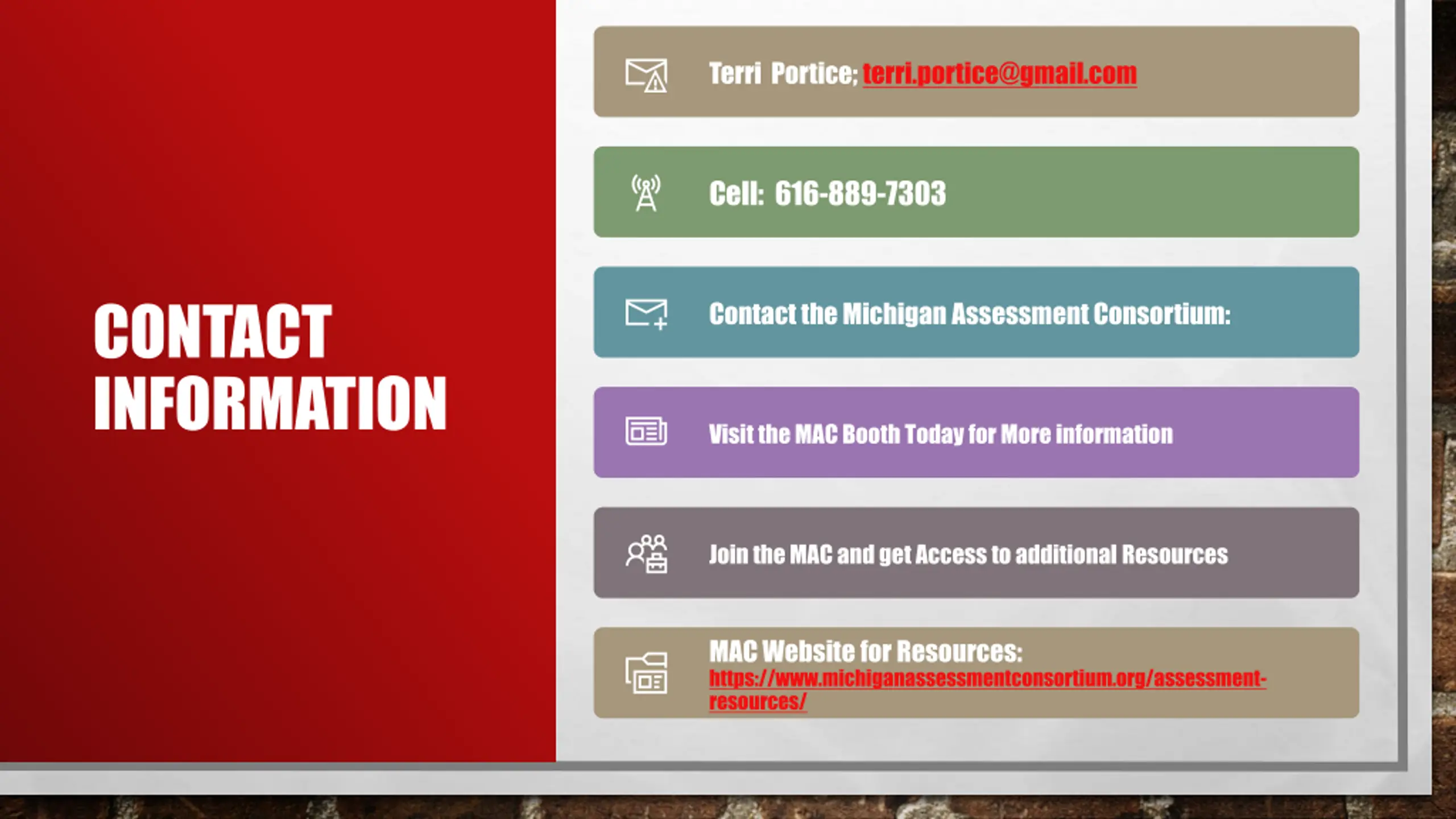 Terri Portice; terri.portice@gmail.com terri.portice@gmail.com Cell: 616-889-7303 CONTACT INFORMATION Contact the Michigan Assessment Consortium: Visit the MAC Booth Today for More information Join the MAC and get Access to additional Resources https://www.michiganassessmentconsortium.org/assessment-resources/ MAC Website for Resources: https://www.michiganassessmentconsortium.org/assessment- resources/ https://www.michiganassessmentconsortium.org/assessment-resources/