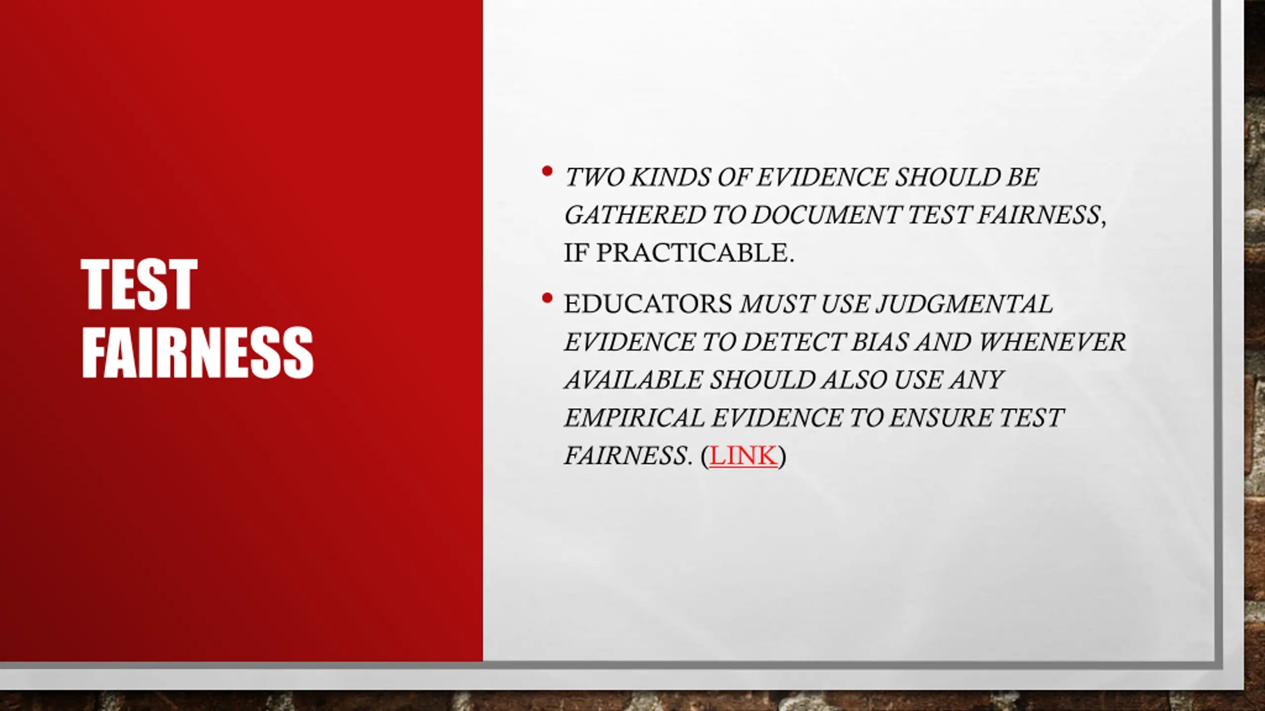 TWO KINDS OF EVIDENCE SHOULD BE GATHERED TO DOCUMENT TEST FAIRNESS, IF PRACTICABLE. EDUCATORS MUST USE JUDGMENTAL EVIDENCE TO DETECT BIAS AND WHENEVER AVAILABLE SHOULD ALSO USE ANY EMPIRICAL EVIDENCE TO ENSURE TEST FAIRNESS. (LINK) TEST FAIRNESS