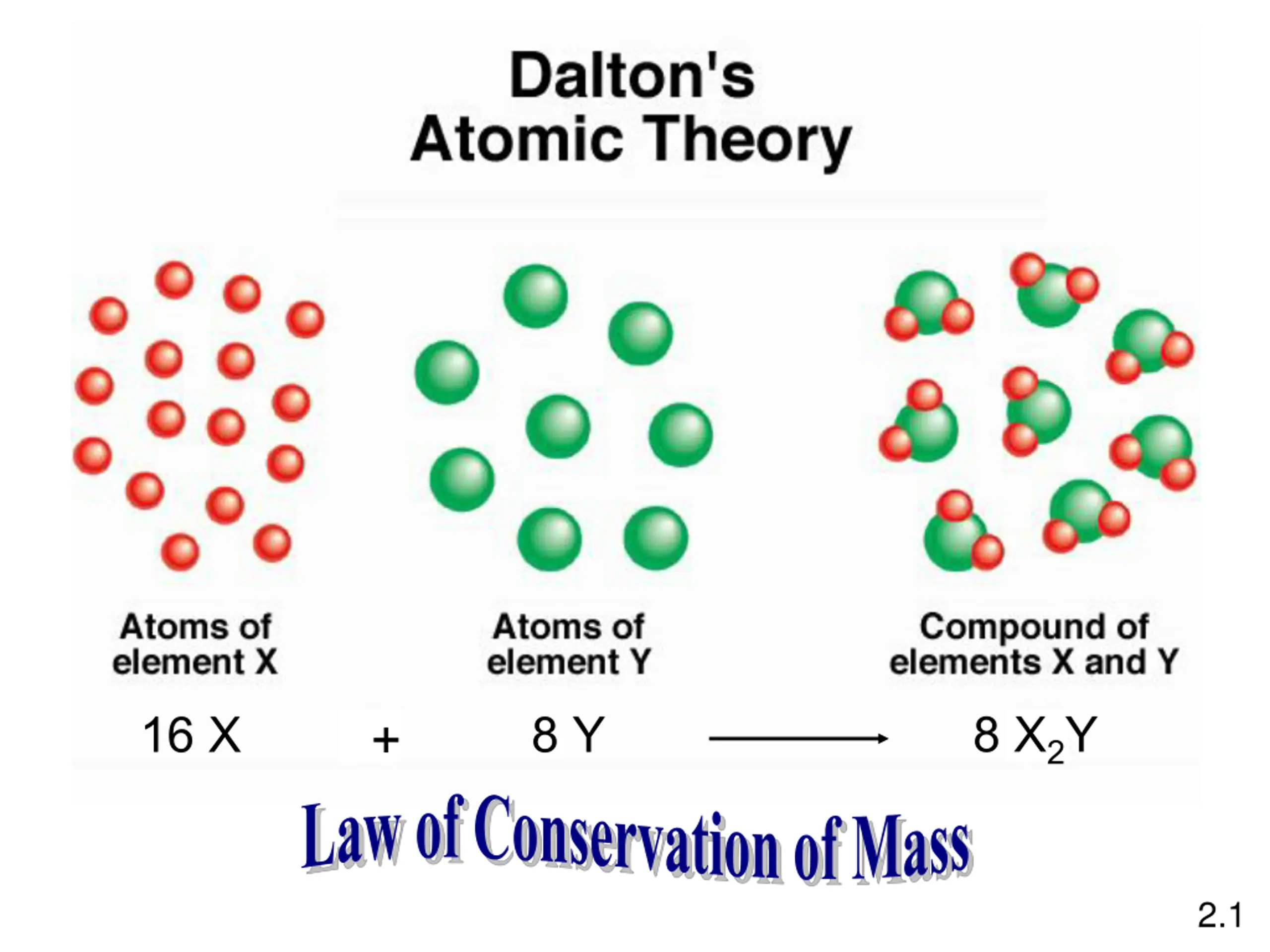 Daltons Atomic Theory (1808) 1. Elements are composed of extremely small particles called atoms. All atoms of a given element are identical. The atoms of one element are different from the atoms of all other elements. 2. Compounds are composed of atoms of more than one element. The relative number of atoms of each element in a given compound is always the same. 3. Chemical reactions only involve the rearrangement of atoms. Atoms are not created or destroyed in chemical reactions. 2.1