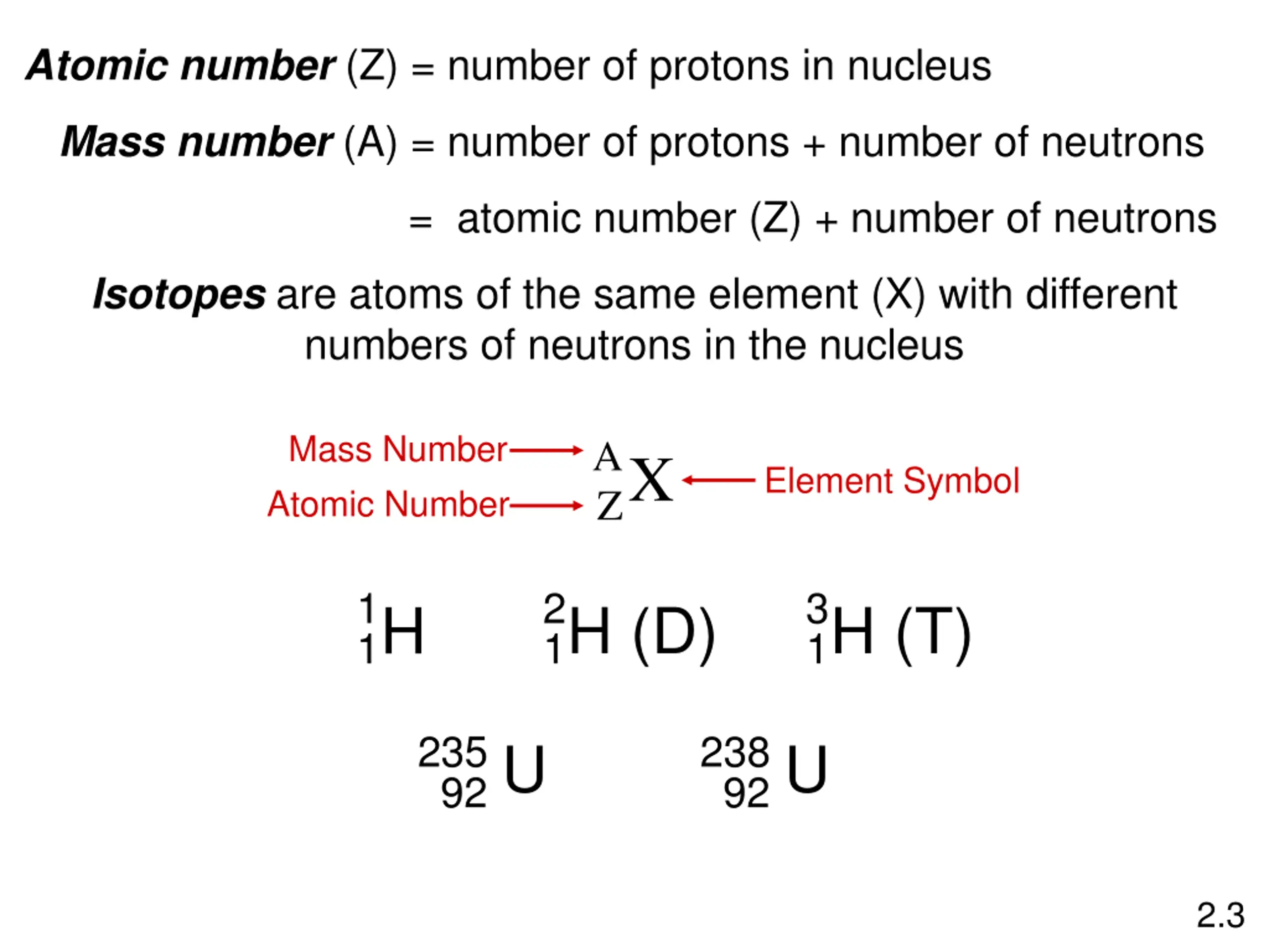Atomic number (Z) = number of protons in nucleus Mass number (A) = number of protons + number of neutrons = atomic number (Z) + number of neutrons Isotopes are atoms of the same element (X) with different numbers of neutrons in the nucleus Mass Number Atomic Number A Z X Element Symbol 1 1 2 1 3 1 H (D) H (T) H 235 92 238 92 U U 2.3