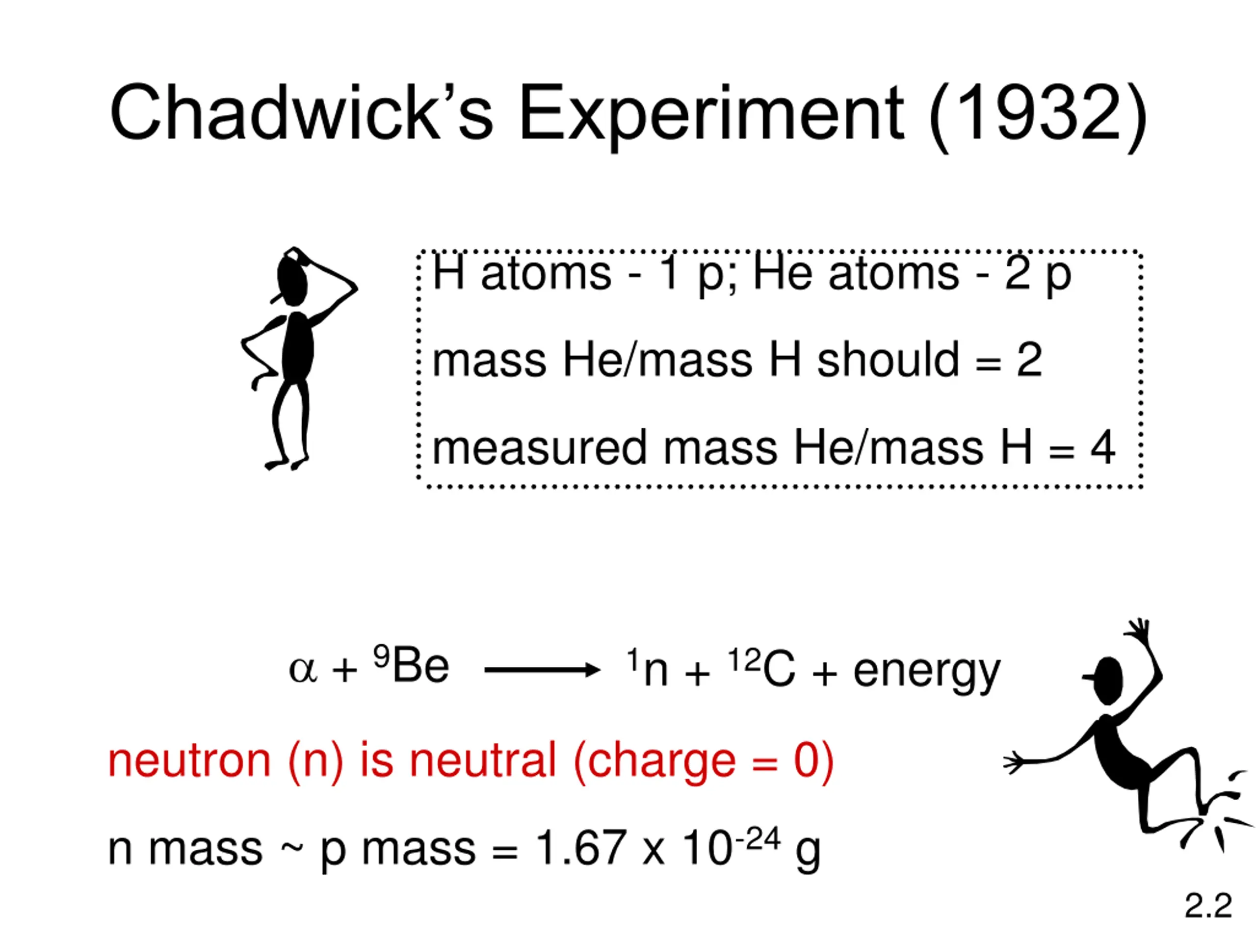Chadwicks Experiment (1932) H atoms - 1 p; He atoms - 2 p mass He/mass H should = 2 measured mass He/mass H = 4 + 9Be 1n + 12C + energy neutron (n) is neutral (charge = 0) n mass ~ p mass = 1.67 x 10-24 g 2.2