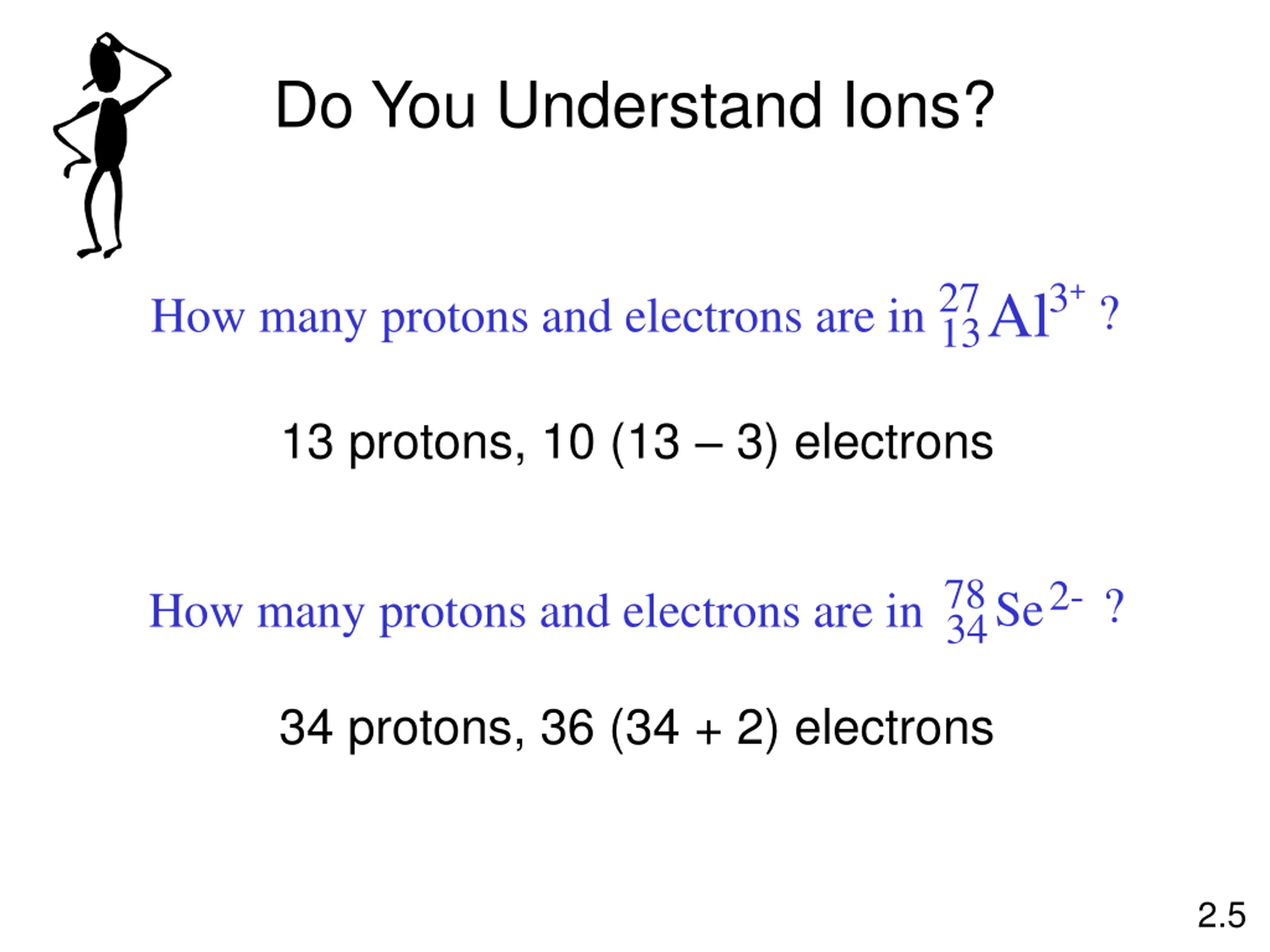 Do You Understand Ions? 27 13 3+ Al ? How many protons and electrons are in 13 protons, 10 (13 3) electrons 78 34 2-? Se How many protons and electrons are in 34 protons, 36 (34 + 2) electrons 2.5