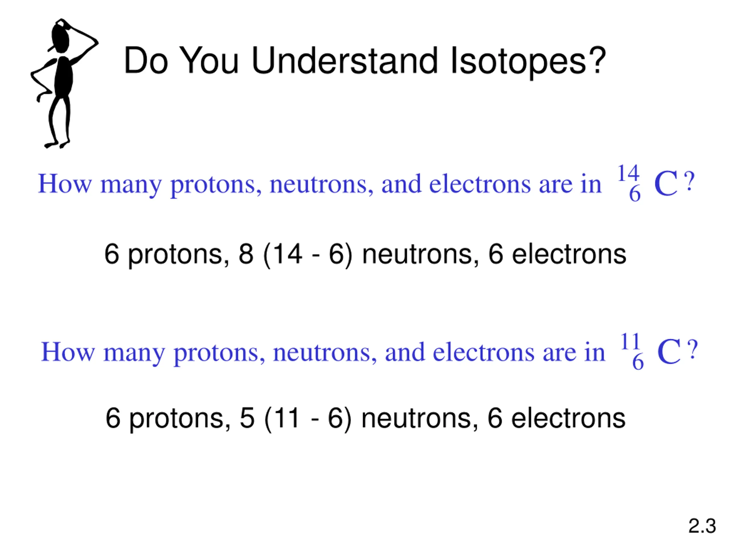 Do You Understand Isotopes? 14 C ? How many protons, neutrons, and electrons are in 6 6 protons, 8 (14 - 6) neutrons, 6 electrons 11 C ? How many protons, neutrons, and electrons are in 6 6 protons, 5 (11 - 6) neutrons, 6 electrons 2.3