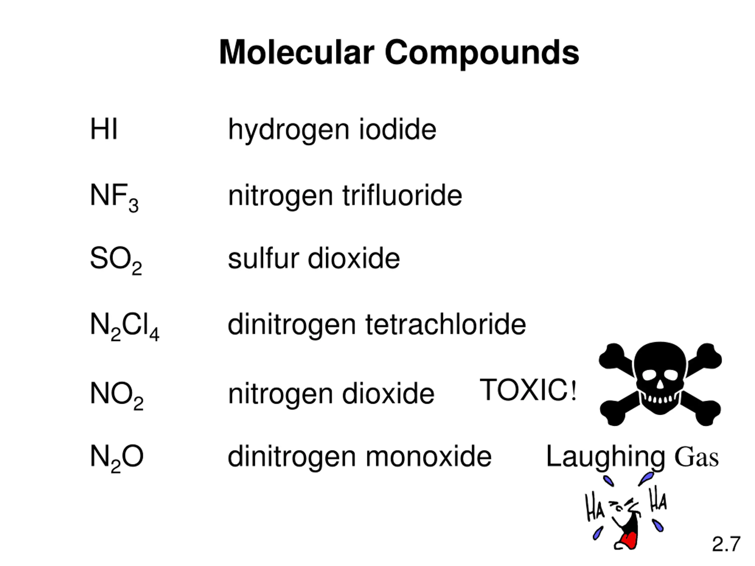 Molecular Compounds HI hydrogen iodide NF3 nitrogen trifluoride SO2 sulfur dioxide N2Cl4 dinitrogen tetrachloride TOXIC! NO2 nitrogen dioxide Laughing Gas N2O dinitrogen monoxide 2.7