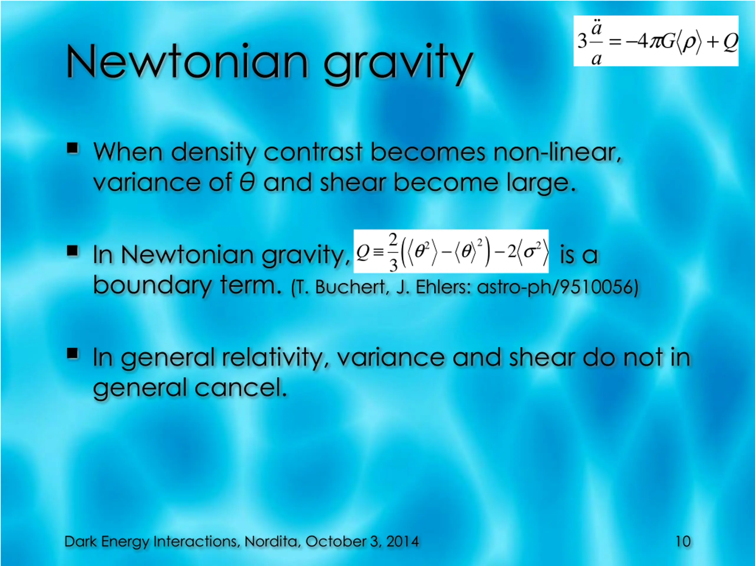 3 a a= -4pG r +Q Newtonian gravity When density contrast becomes non-linear, variance of and shear become large. )-2 s2 ( Q 2 In Newtonian gravity, boundary term. (T. Buchert, J. Ehlers: astro-ph/9510056) 2 is a q2- q 3 In general relativity, variance and shear do not in general cancel. Dark Energy Interactions, Nordita, October 3, 2014 10