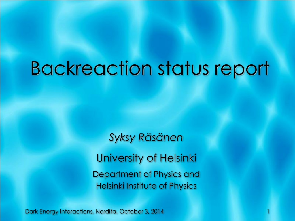 Backreaction status report Syksy R s nen University of Helsinki Department of Physics and Helsinki Institute of Physics Dark Energy Interactions, Nordita, October 3, 2014 1