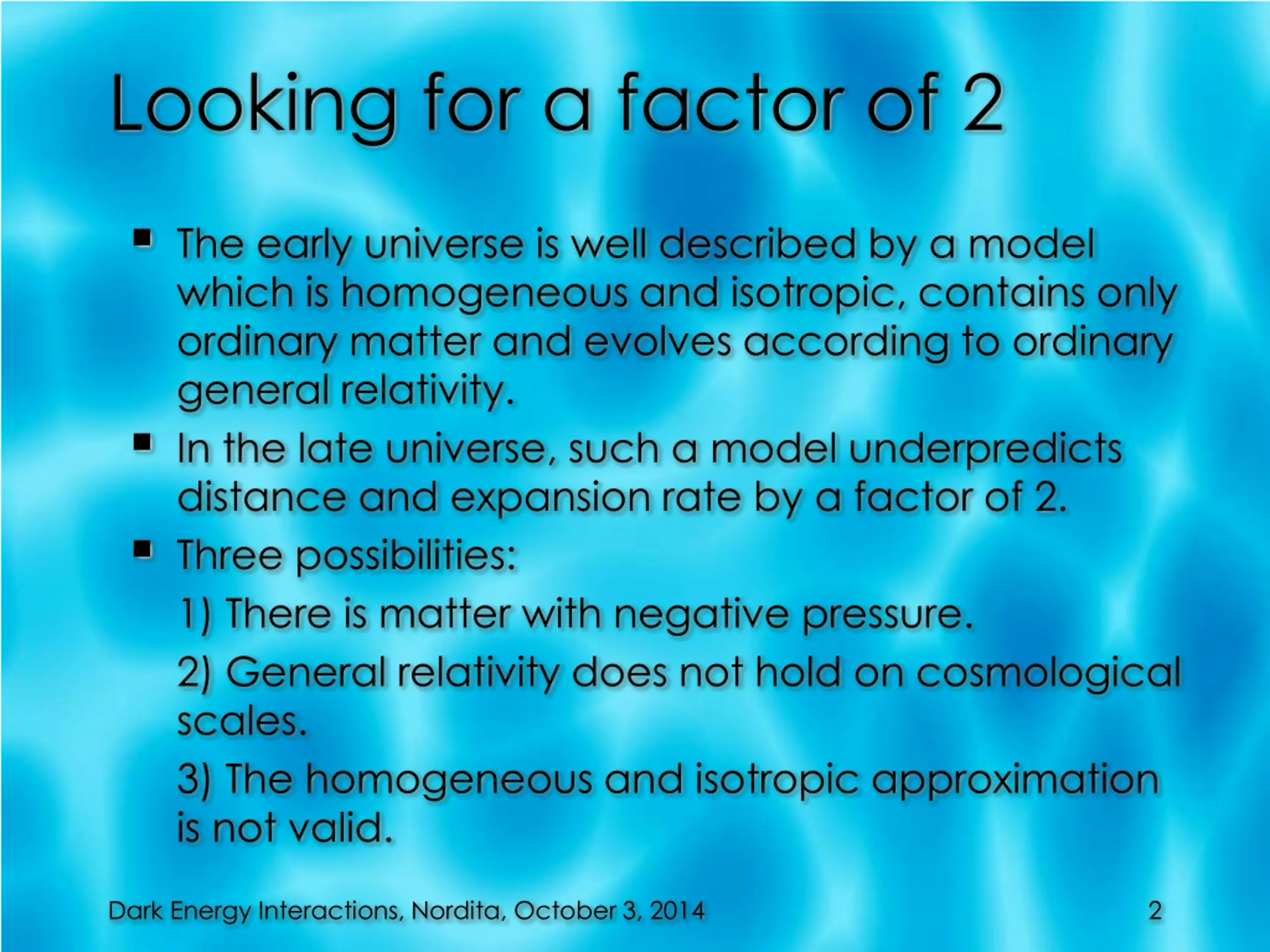 Looking for a factor of 2 The early universe is well described by a model which is homogeneous and isotropic, contains only ordinary matter and evolves according to ordinary general relativity. In the late universe, such a model underpredicts distance and expansion rate by a factor of 2. Three possibilities: 1) There is matter with negative pressure. 2) General relativity does not hold on cosmological scales. 3) The homogeneous and isotropic approximation is not valid. Dark Energy Interactions, Nordita, October 3, 2014 2