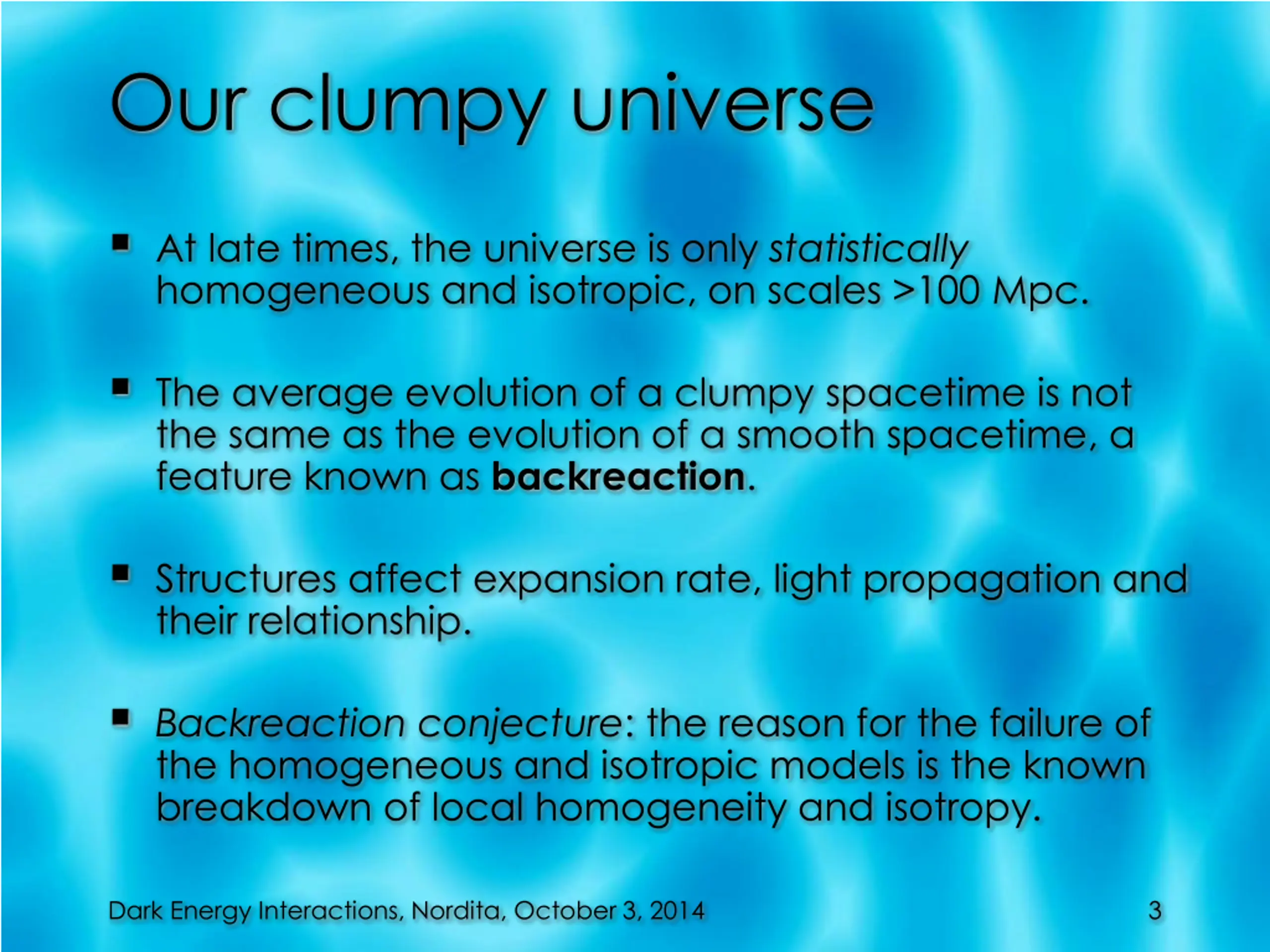 Our clumpy universe At late times, the universe is only statistically homogeneous and isotropic, on scales >100 Mpc. The average evolution of a clumpy spacetime is not the same as the evolution of a smooth spacetime, a feature known as backreaction. Structures affect expansion rate, light propagation and their relationship. Backreaction conjecture: the reason for the failure of the homogeneous and isotropic models is the known breakdown of local homogeneity and isotropy. Dark Energy Interactions, Nordita, October 3, 2014 3