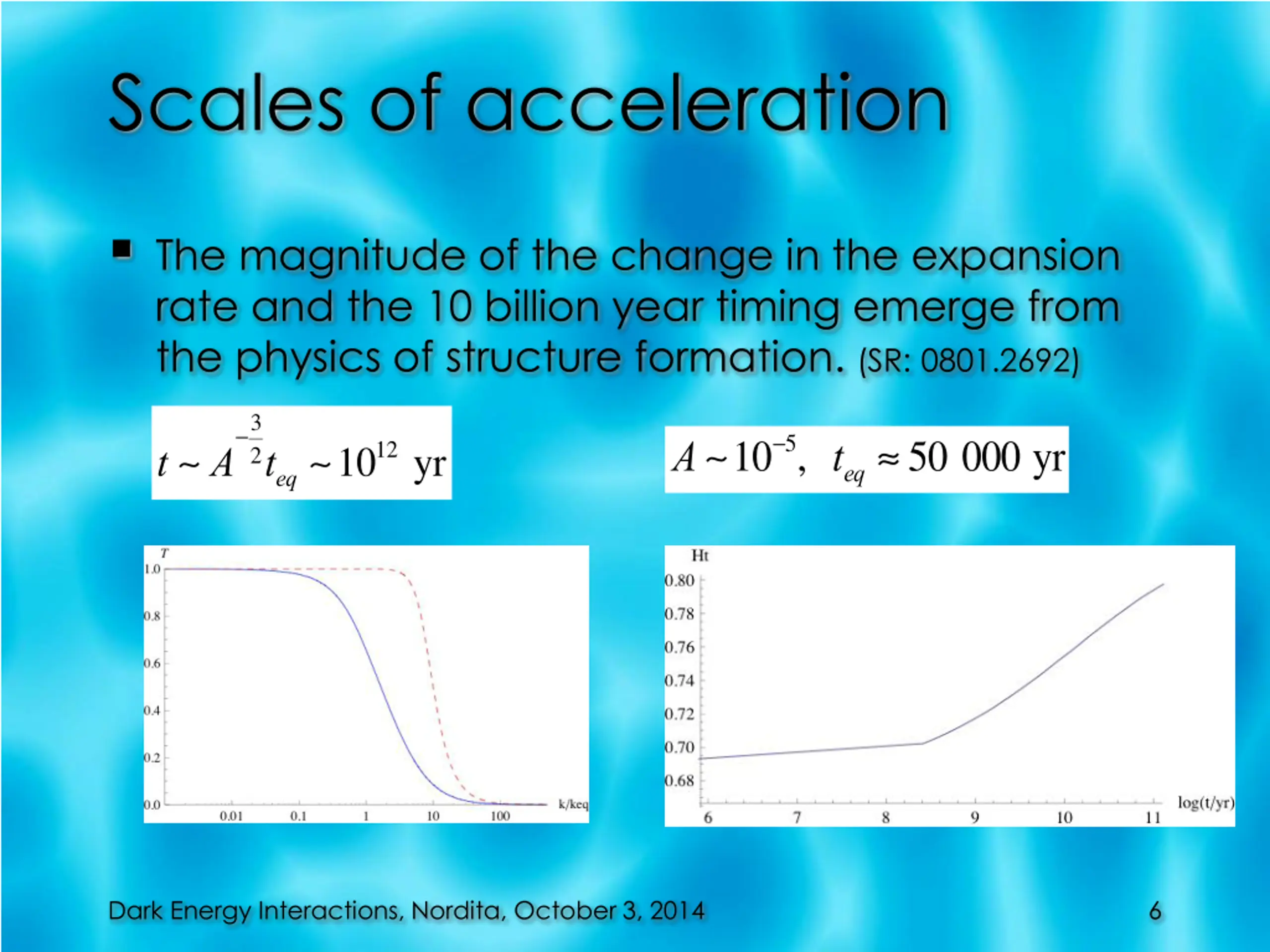 Scales of acceleration The magnitude of the change in the expansion rate and the 10 billion year timing emerge from the physics of structure formation. (SR: 0801.2692) -3 A~10-5, teq 50 000 yr t ~ A 2teq~1012 yr Dark Energy Interactions, Nordita, October 3, 2014 6