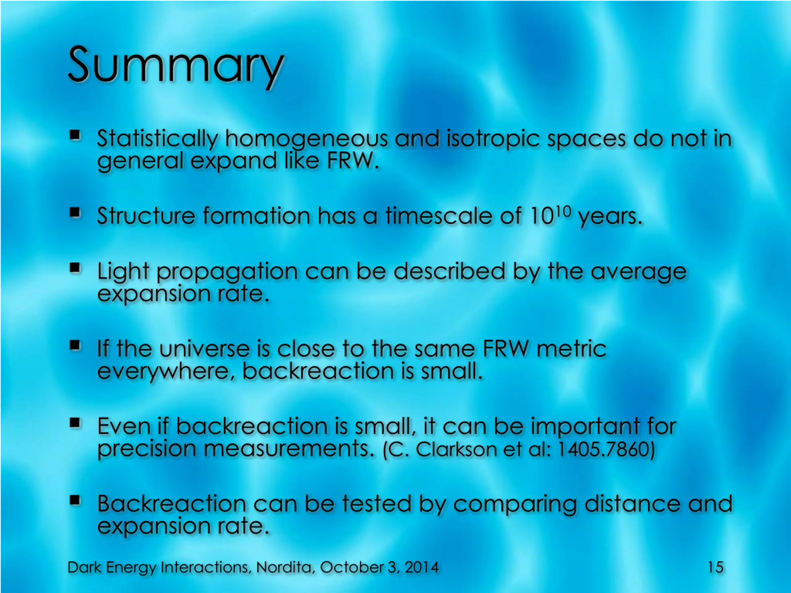 Summary Statistically homogeneous and isotropic spaces do not in general expand like FRW. Structure formation has a timescale of 1010 years. Light propagation can be described by the average expansion rate. If the universe is close to the same FRW metric everywhere, backreaction is small. Even if backreaction is small, it can be important for precision measurements. (C. Clarkson et al: 1405.7860) Backreaction can be tested by comparing distance and expansion rate. Dark Energy Interactions, Nordita, October 3, 2014 15