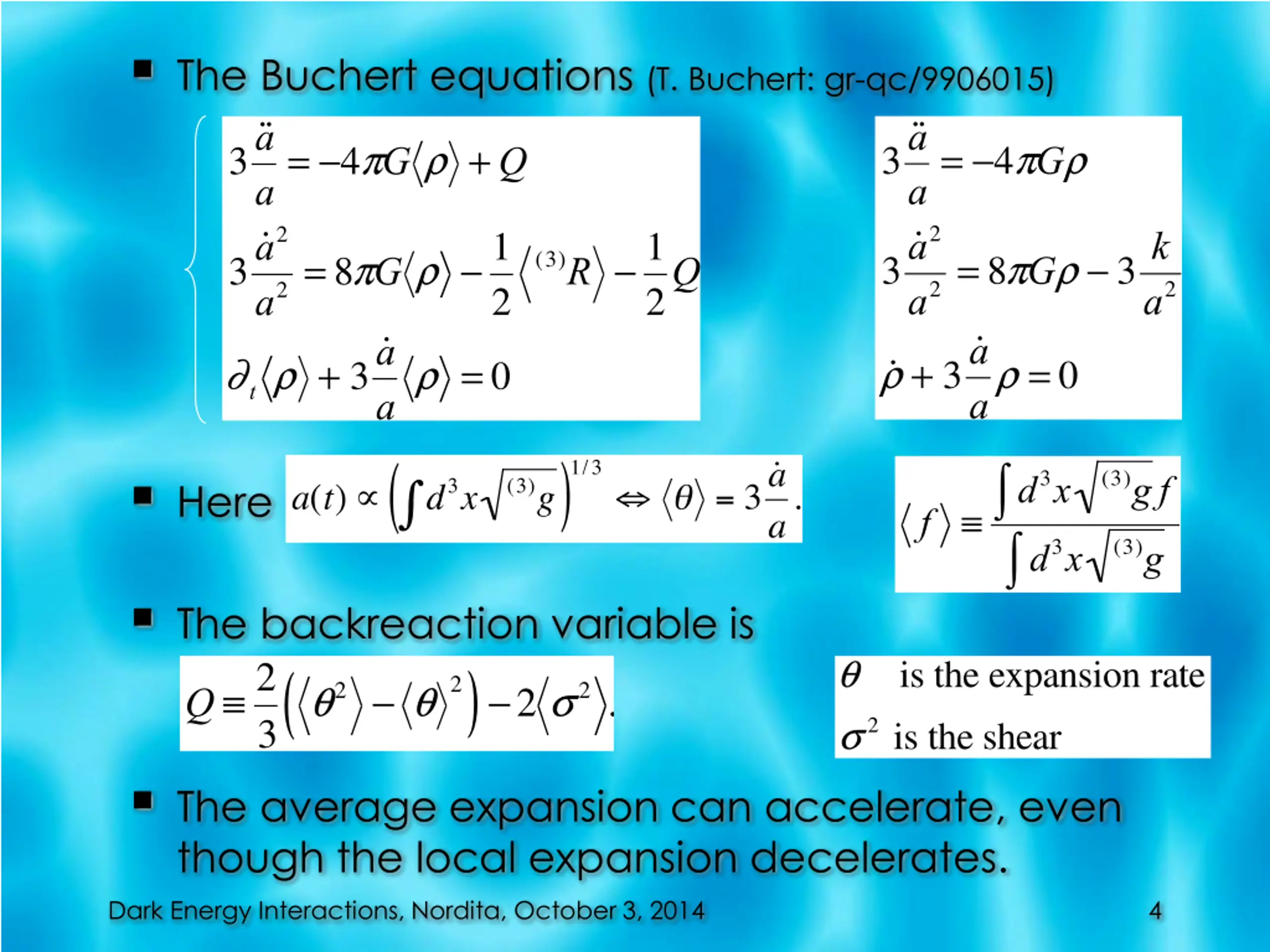 The Buchert equations (T. Buchert: gr-qc/9906015) 3 a a= -4pGr 3 a 2 3 a a= -4pG r +Q 3 a 2 a2=8pG r -1 tr + 3 a (3)R -1 a2= 8pGr - 3k r + 3 a ar = 0 2Q a2 2 r =0 a Here d3x (3)g f f d3x (3)g The backreaction variable is Q 2 3 )-2 s2. ( q is the expansion rate s2 is the shear 2 q2- q The average expansion can accelerate, even though the local expansion decelerates. Dark Energy Interactions, Nordita, October 3, 2014 4
