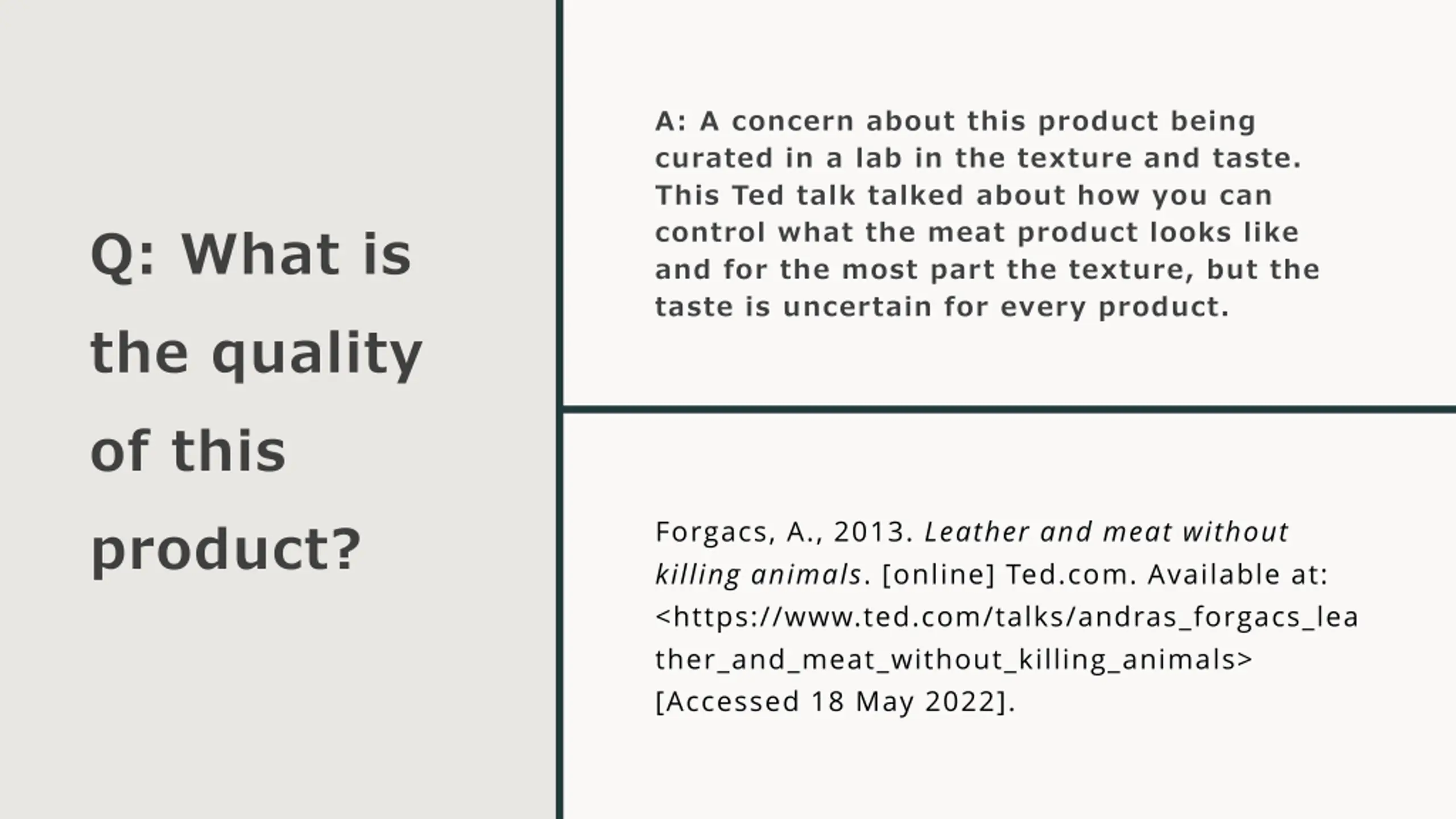 A: A concern about this product being curated in a lab in the texture and taste. This Ted talk talked about how you can control what the meat product looks like and for the most part the texture, but the taste is uncertain for every product. Q: What is the quality of this product? Forgacs, A., 2013. Leather and meat without killing animals. [online] Ted.com. Available at: <https://www.ted.com/talks/andras_forgacs_lea ther_and_meat_without_killing_animals> [Accessed 18 May 2022].