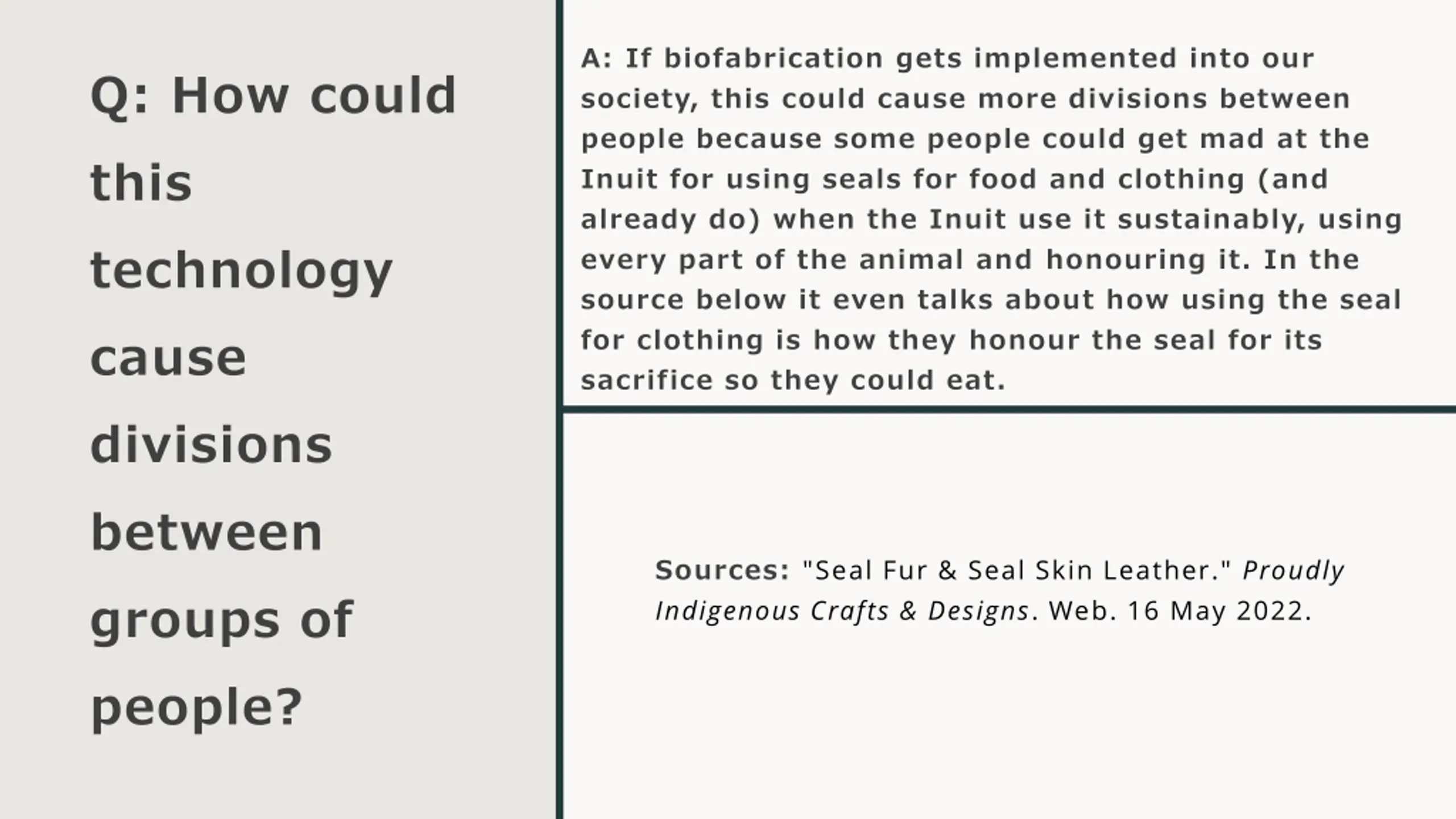 A: If biofabrication gets implemented into our society, this could cause more divisions between people because some people could get mad at the Inuit for using seals for food and clothing (and already do) when the Inuit use it sustainably, using every part of the animal and honouring it. In the source below it even talks about how using the seal for clothing is how they honour the seal for its sacrifice so they could eat. Q: How could this technology cause divisions between groups of people? Sources: "Seal Fur & Seal Skin Leather." Proudly Indigenous Crafts & Designs. Web. 16 May 2022.