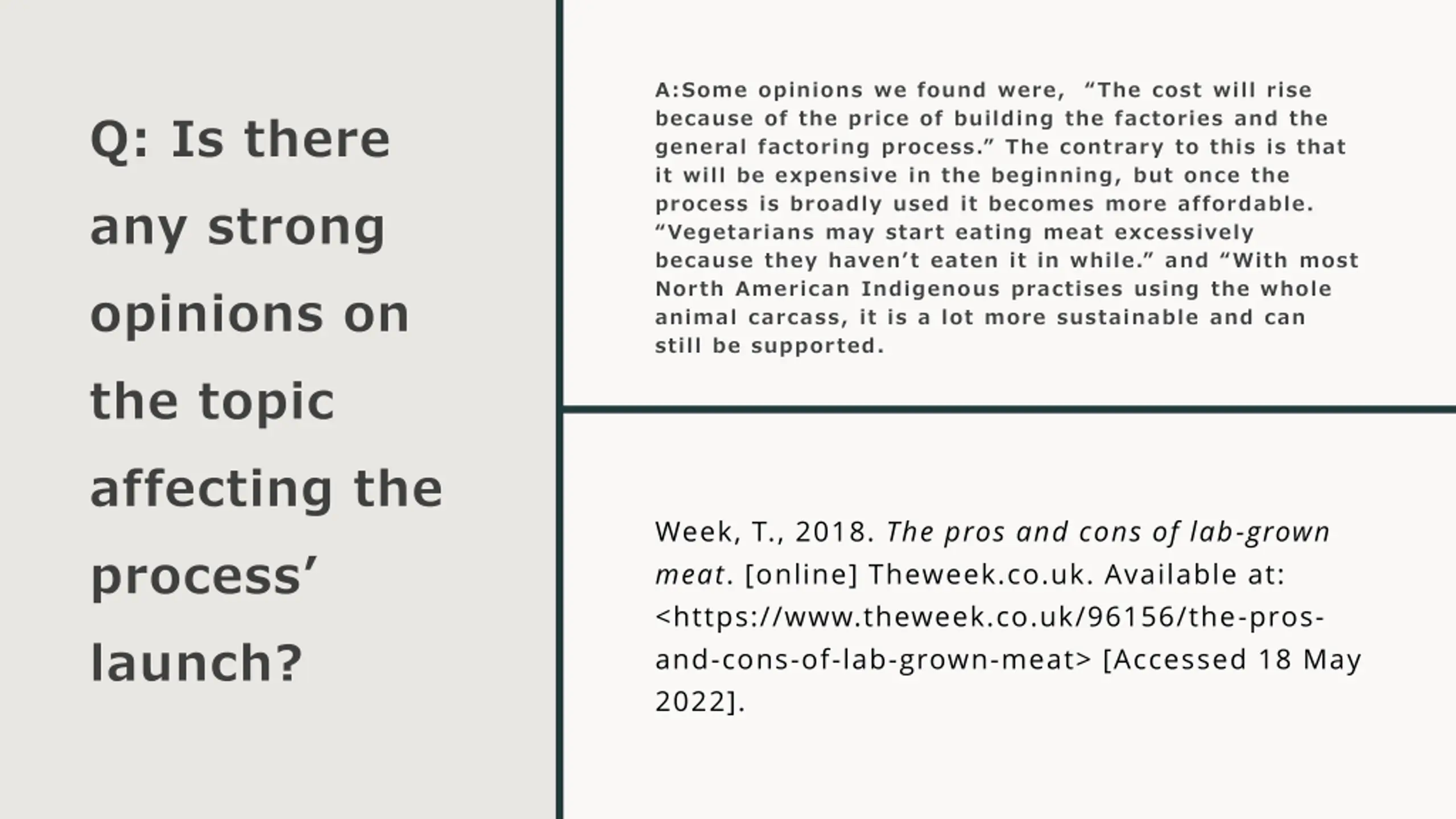 A:Some opinions we found were, The cost will rise because of the price of building the factories and the general factoring process. The contrary to this is that it will be expensive in the beginning, but once the process is broadly used it becomes more affordable. Vegetarians may start eating meat excessively because they haven t eaten it in while. and With most North American Indigenous practises using the whole animal carcass, it is a lot more sustainable and can still be supported. Q: Is there any strong opinions on the topic affecting the process launch? Week, T., 2018. The pros and cons of lab-grown meat. [online] Theweek.co.uk. Available at: <https://www.theweek.co.uk/96156/the-pros- and-cons-of-lab-grown-meat> [Accessed 18 May 2022].
