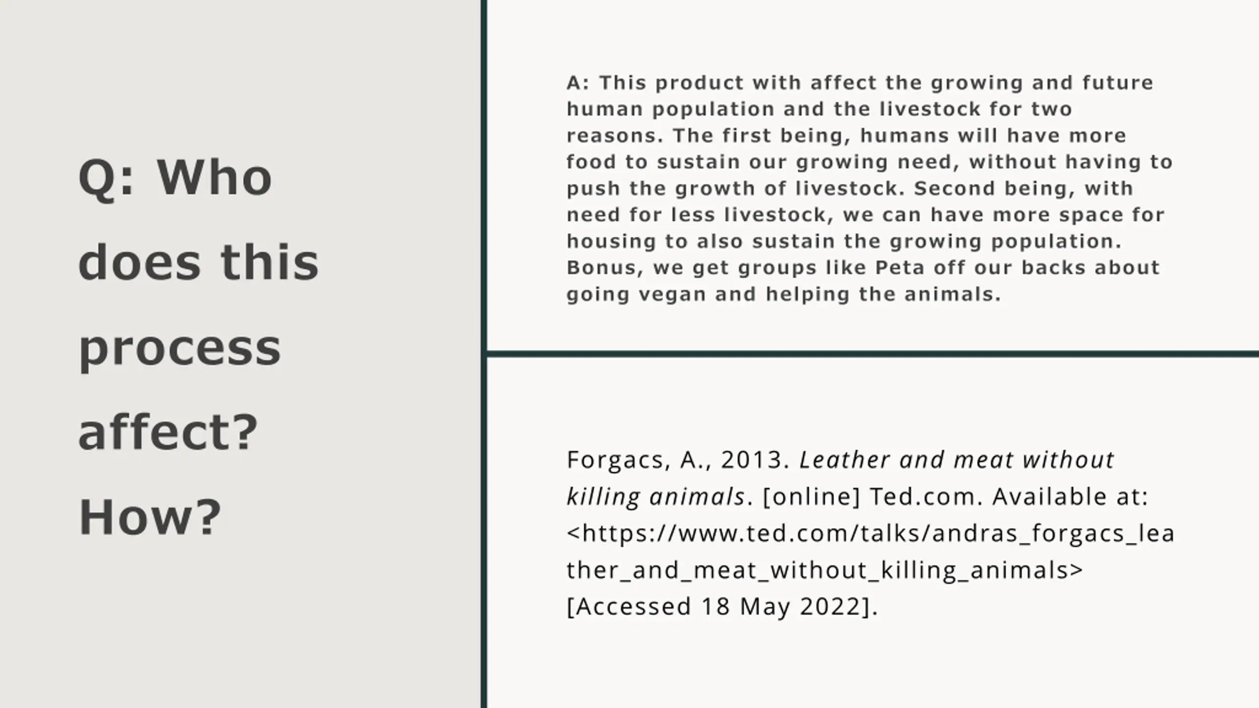 A: This product with affect the growing and future human population and the livestock for two reasons. The first being, humans will have more food to sustain our growing need, without having to push the growth of livestock. Second being, with need for less livestock, we can have more space for housing to also sustain the growing population. Bonus, we get groups like Peta off our backs about going vegan and helping the animals. Q: Who does this process affect? How? Forgacs, A., 2013. Leather and meat without killing animals. [online] Ted.com. Available at: <https://www.ted.com/talks/andras_forgacs_lea ther_and_meat_without_killing_animals> [Accessed 18 May 2022].