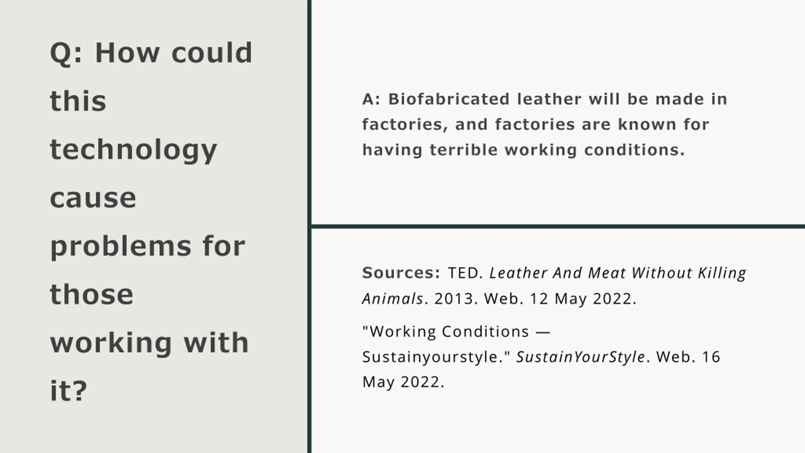 Q: How could this technology cause problems for those working with it? A: Biofabricated leather will be made in factories, and factories are known for having terrible working conditions. Sources: TED. Leather And Meat Without Killing Animals. 2013. Web. 12 May 2022. "Working Conditions Sustainyourstyle." SustainYourStyle. Web. 16 May 2022.