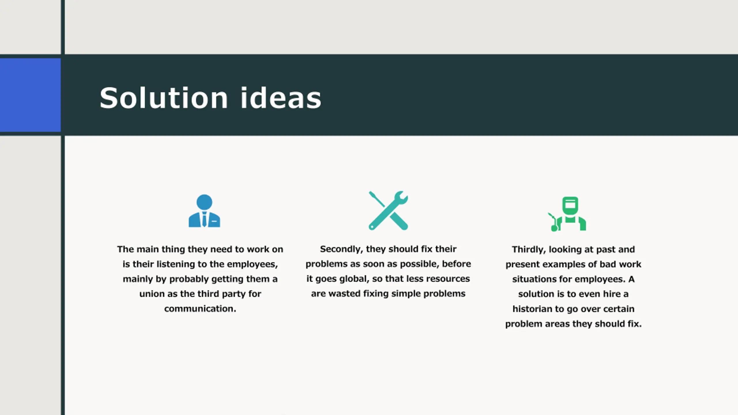 Solution ideas Secondly, they should fix their problems as soon as possible, before it goes global, so that less resources are wasted fixing simple problems The main thing they need to work on is their listening to the employees, mainly by probably getting them a union as the third party for communication. Thirdly, looking at past and present examples of bad work situations for employees. A solution is to even hire a historian to go over certain problem areas they should fix.