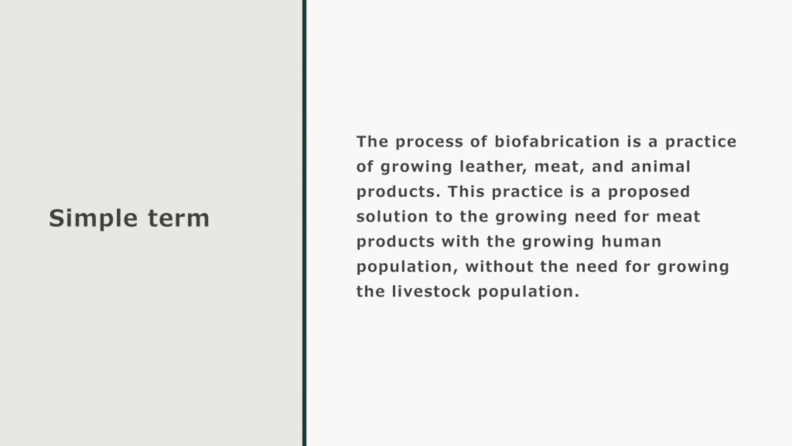The process of biofabrication is a practice of growing leather, meat, and animal products. This practice is a proposed solution to the growing need for meat products with the growing human population, without the need for growing the livestock population. Simple term