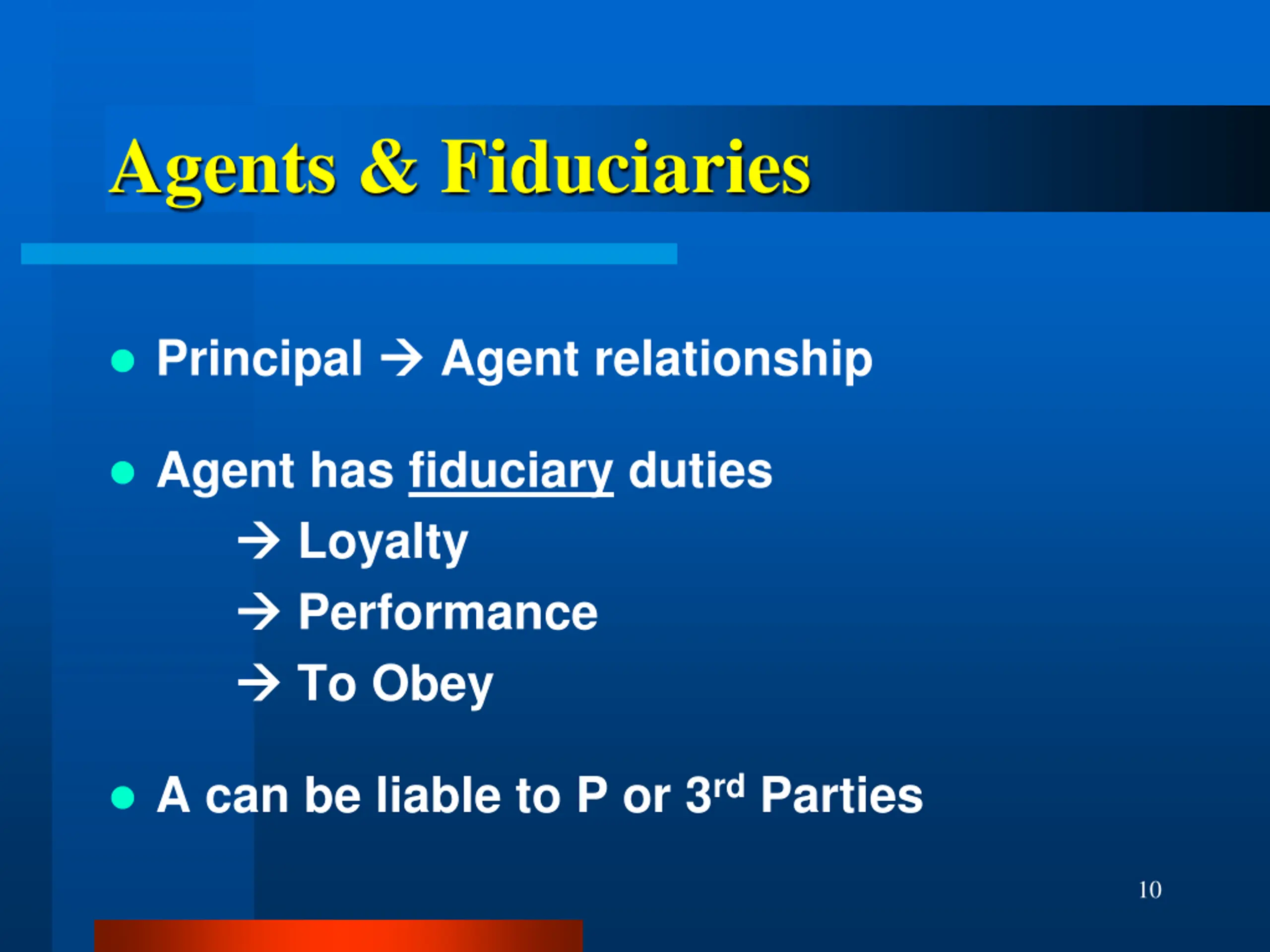 Agents & Fiduciaries Principal Agent relationship Agent has fiduciary duties Loyalty Performance To Obey A can be liable to P or 3rd Parties 10