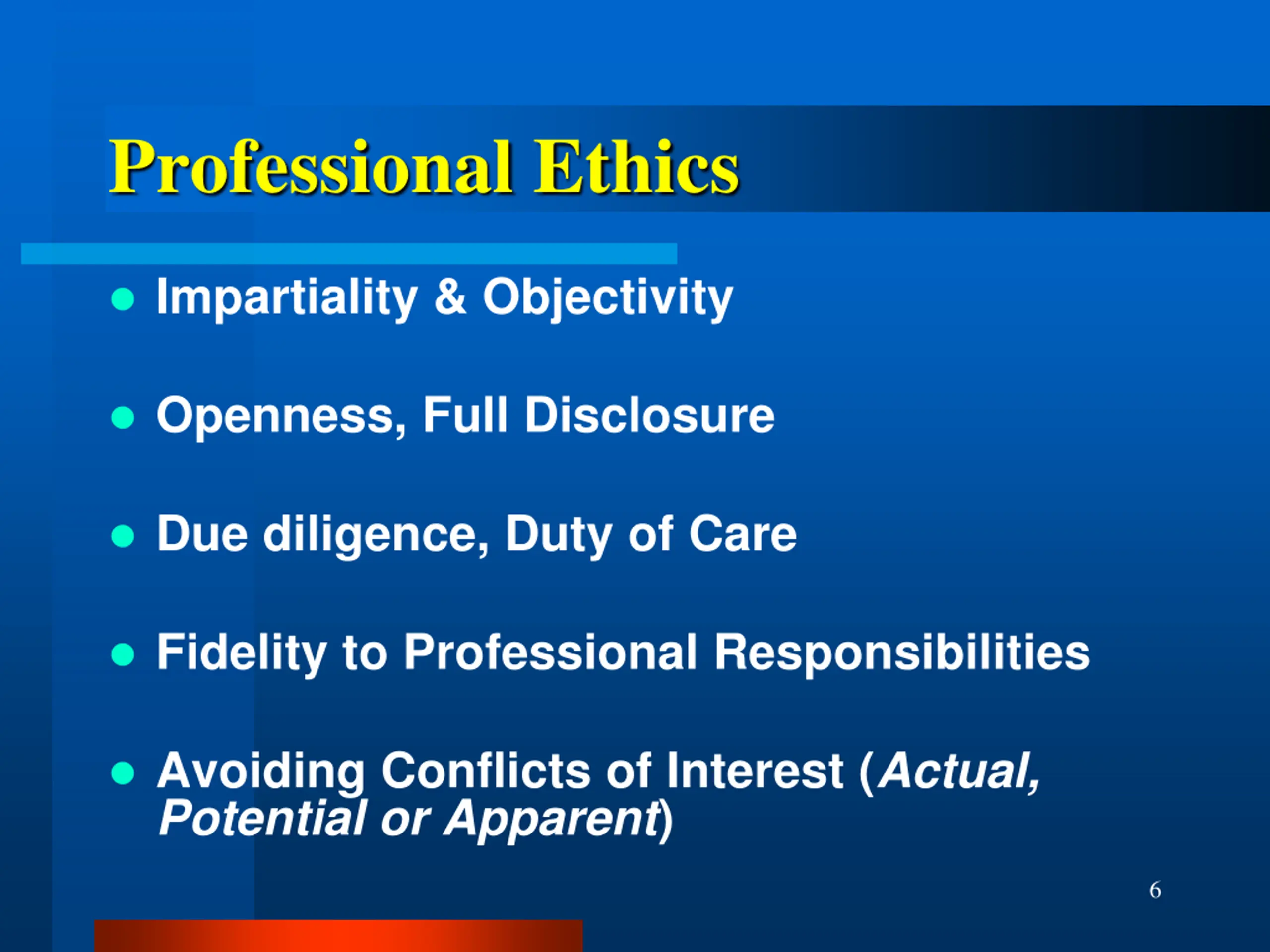 Professional Ethics Impartiality & Objectivity Openness, Full Disclosure Due diligence, Duty of Care Fidelity to Professional Responsibilities Avoiding Conflicts of Interest (Actual, Potential or Apparent) 6