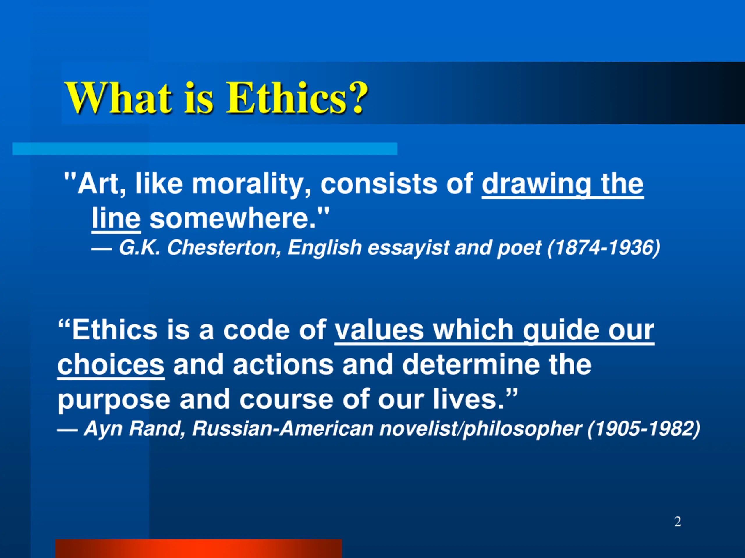 What is Ethics? "Art, like morality, consists of drawing the line somewhere." G.K. Chesterton, English essayist and poet (1874-1936) Ethics is a code of values which guide our choices and actions and determine the purpose and course of our lives. Ayn Rand, Russian-American novelist/philosopher (1905-1982) 2