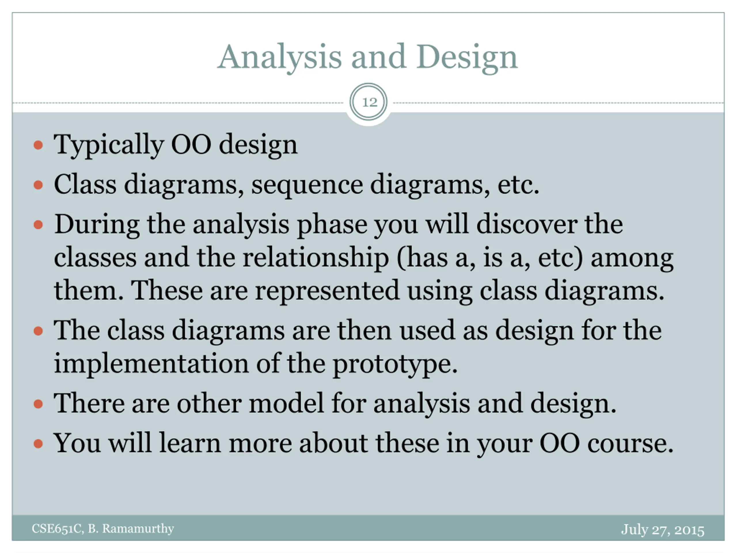 Analysis and Design 12 Typically OO design Class diagrams, sequence diagrams, etc. During the analysis phase you will discover the classes and the relationship (has a, is a, etc) among them. These are represented using class diagrams. The class diagrams are then used as design for the implementation of the prototype. There are other model for analysis and design. You will learn more about these in your OO course. July 27, 2015 CSE651C, B. Ramamurthy