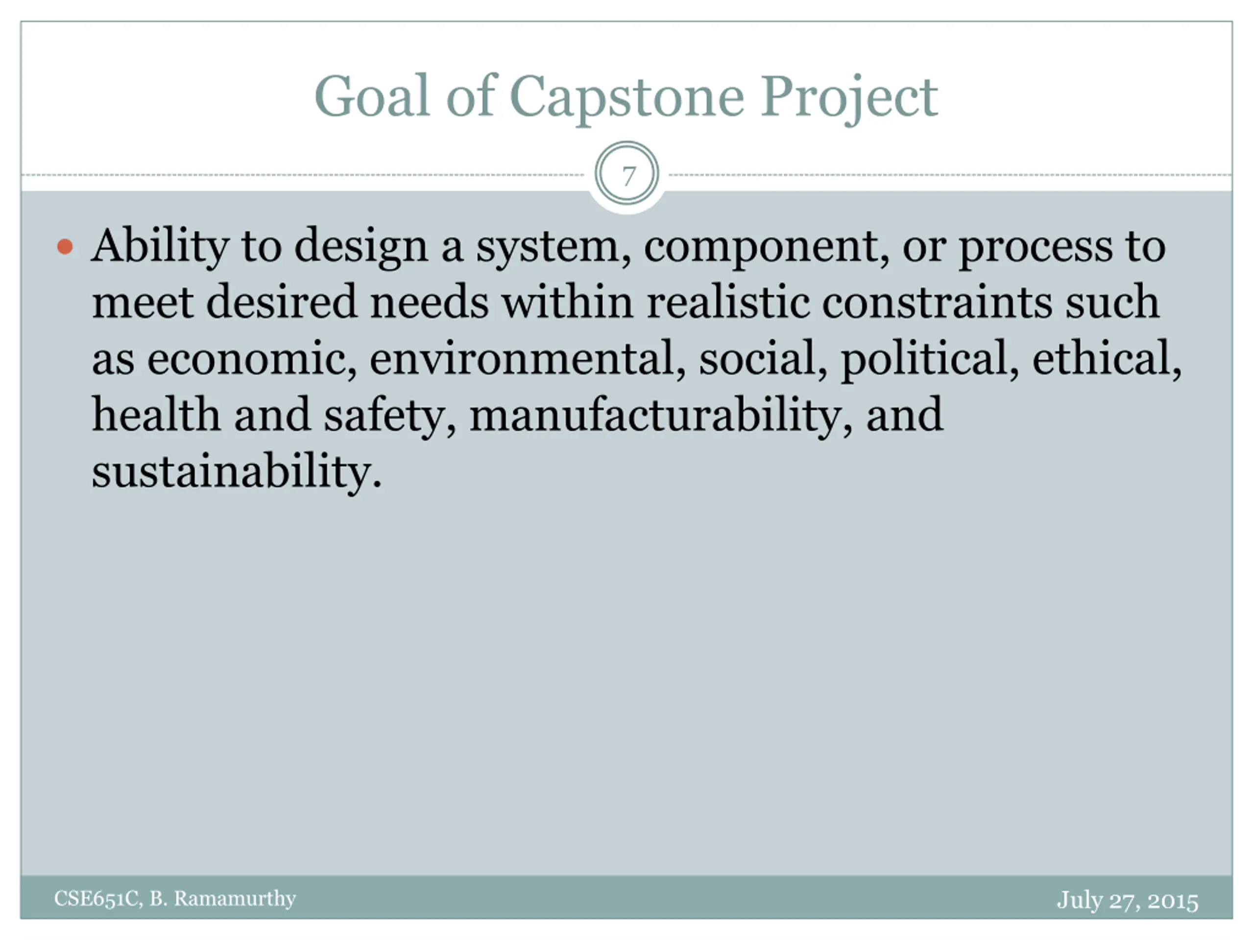 Goal of Capstone Project 7 Ability to design a system, component, or process to meet desired needs within realistic constraints such as economic, environmental, social, political, ethical, health and safety, manufacturability, and sustainability. July 27, 2015 CSE651C, B. Ramamurthy