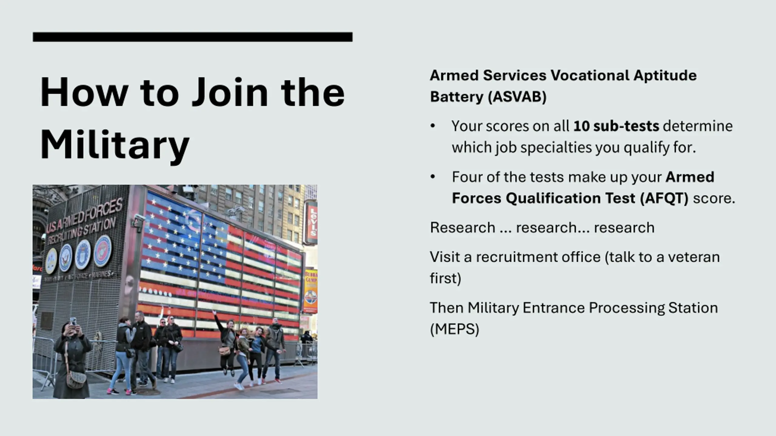 Armed Services Vocational Aptitude Battery (ASVAB) How to Join the Military Your scores on all 10 sub-tests determine which job specialties you qualify for. Four of the tests make up your Armed Forces Qualification Test (AFQT) score. Research research research Visit a recruitment office (talk to a veteran first) Then Military Entrance Processing Station (MEPS)