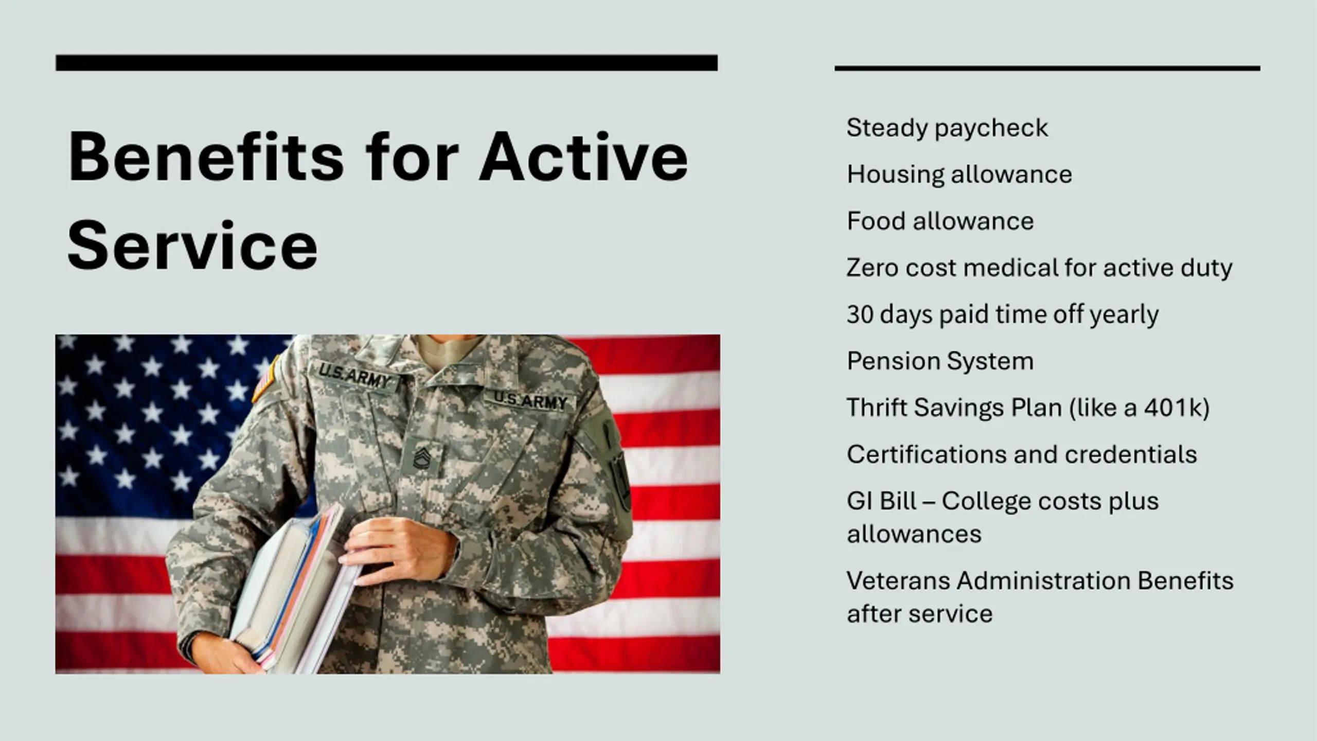 Steady paycheck Benefits for Active Service Housing allowance Food allowance Zero cost medical for active duty 30 days paid time off yearly Pension System Thrift Savings Plan (like a 401k) Certifications and credentials GI Bill College costs plus allowances Veterans Administration Benefits after service