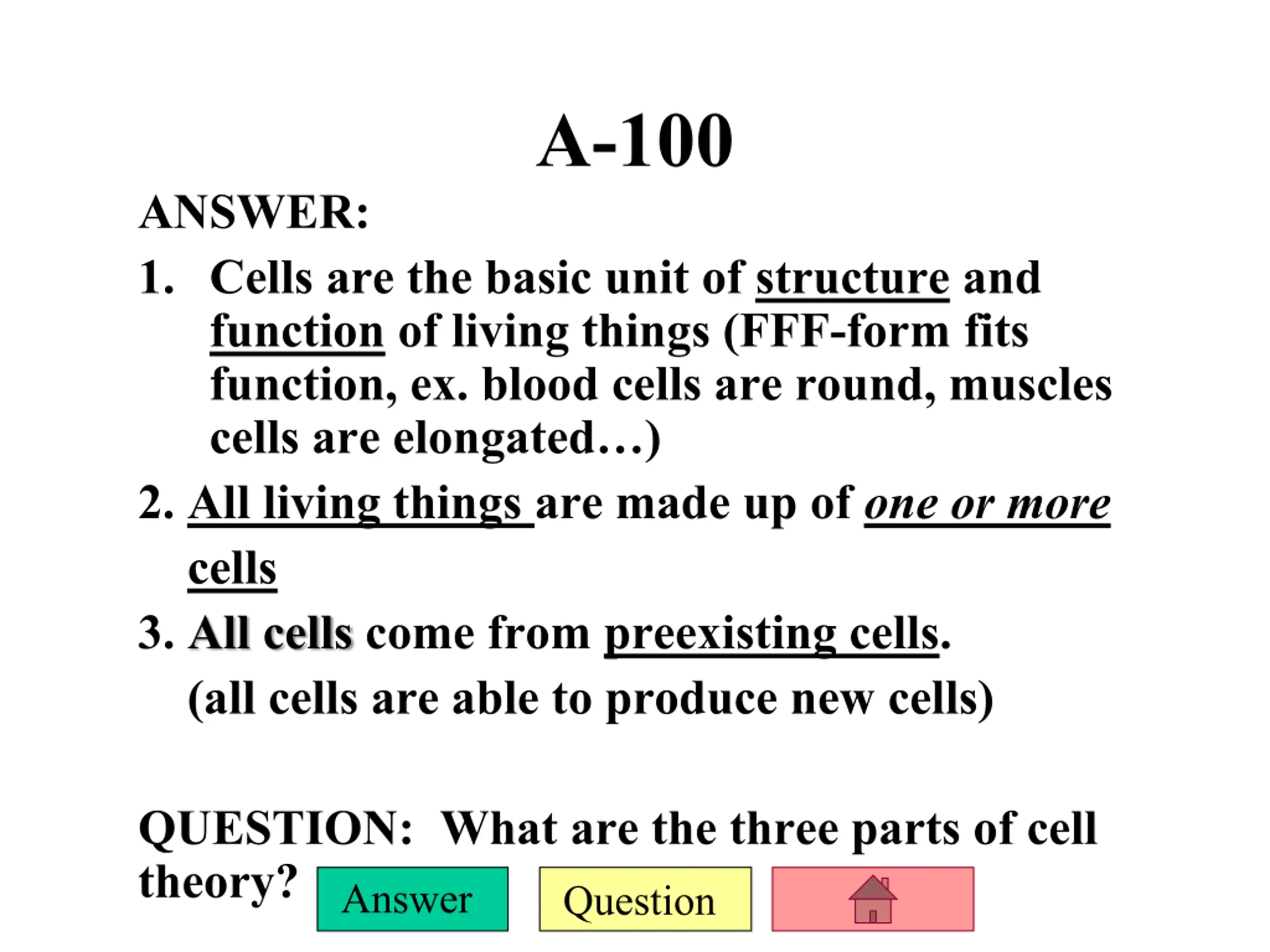 A-100 ANSWER: 1. Cells are the basic unit of structure and function of living things (FFF-form fits function, ex. blood cells are round, muscles cells are elongated ) 2. All living things are made up of one or more cells 3. All cells come from preexisting cells. (all cells are able to produce new cells) QUESTION: What are the three parts of cell theory? Answer Question