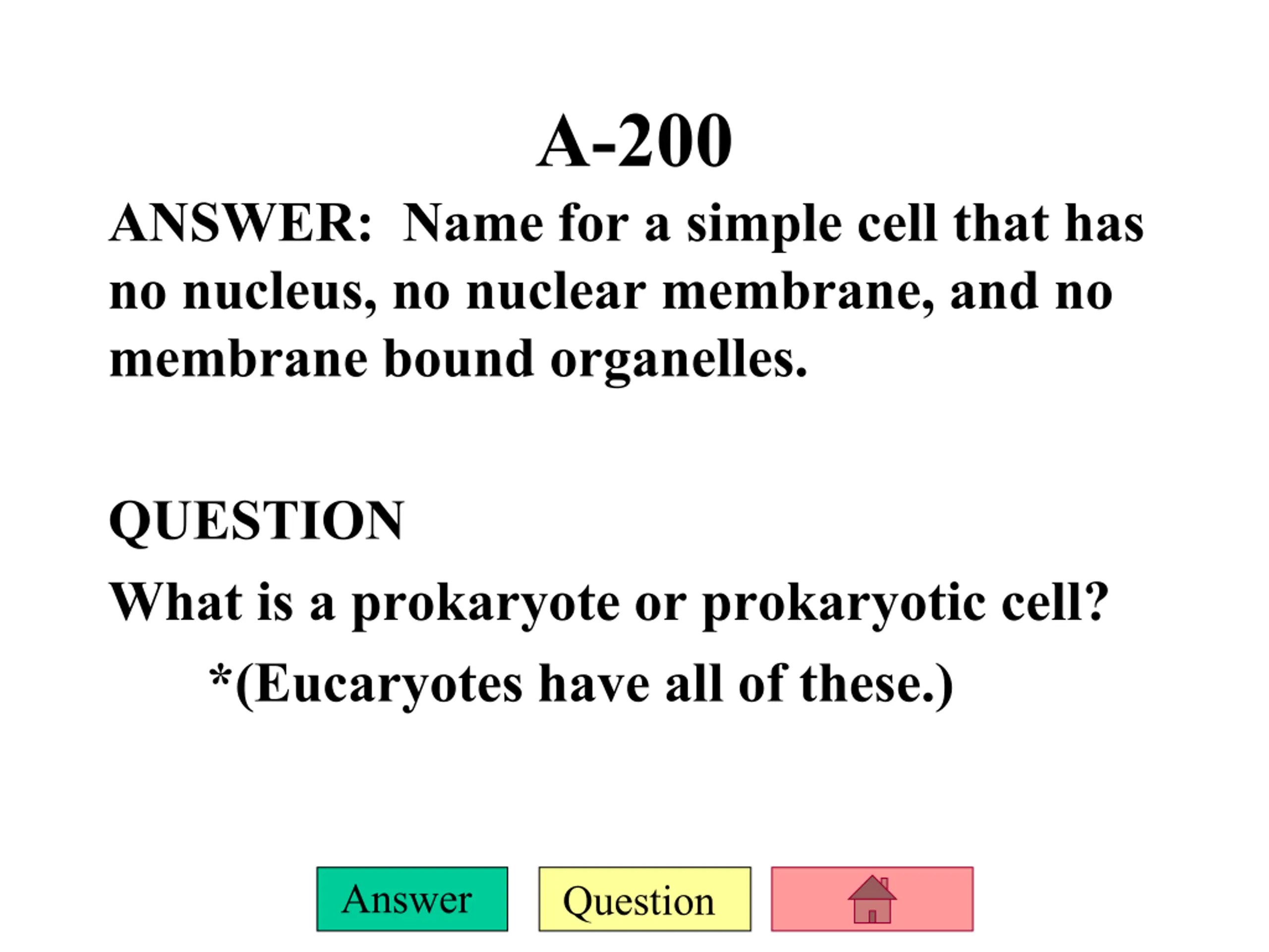 A-200 ANSWER: Name for a simple cell that has no nucleus, no nuclear membrane, and no membrane bound organelles. QUESTION What is a prokaryote or prokaryotic cell? *(Eucaryotes have all of these.) Answer Question